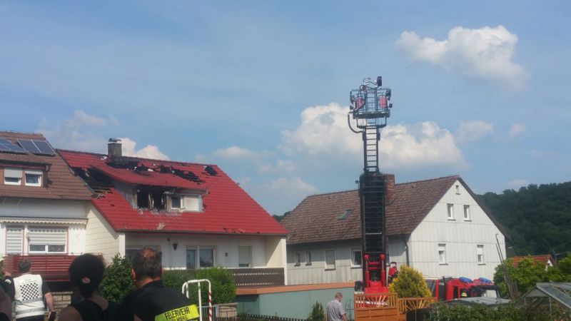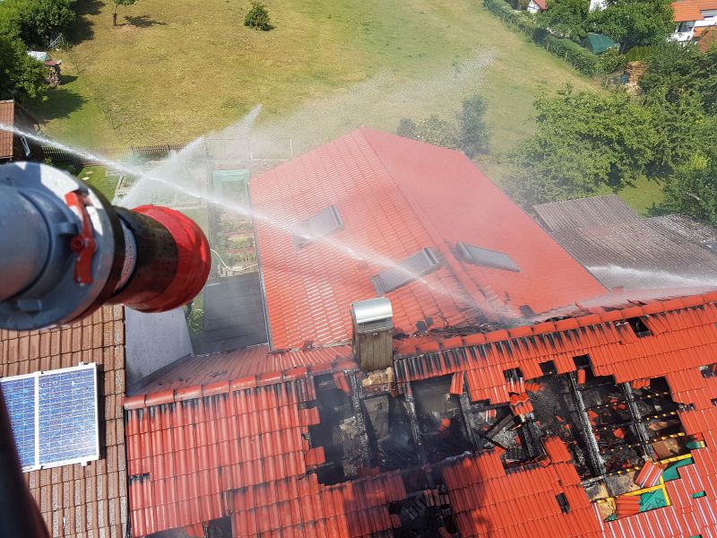 Über die Drehleiter wurde auch die Dachhaut teilweise geöffnet, um die Brandbekämpfung zu beschleunigen. Weitere Trupps unter Atemschutz löschten im Innenangriff die restlichen kleineren Brandherde des Dachstuhls ab.