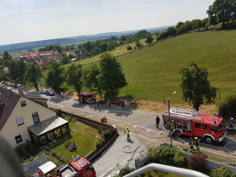 Gemeldet war der Brand einer Küche in Colmberg. Beim Eintreffen hatte sich das Feuer bereits auf den Dachstuhl ausgedehnt. Auch diesmal sah man bereits weit vor der eigentlichen Einsatzstelle die dichte Rauchwolke.