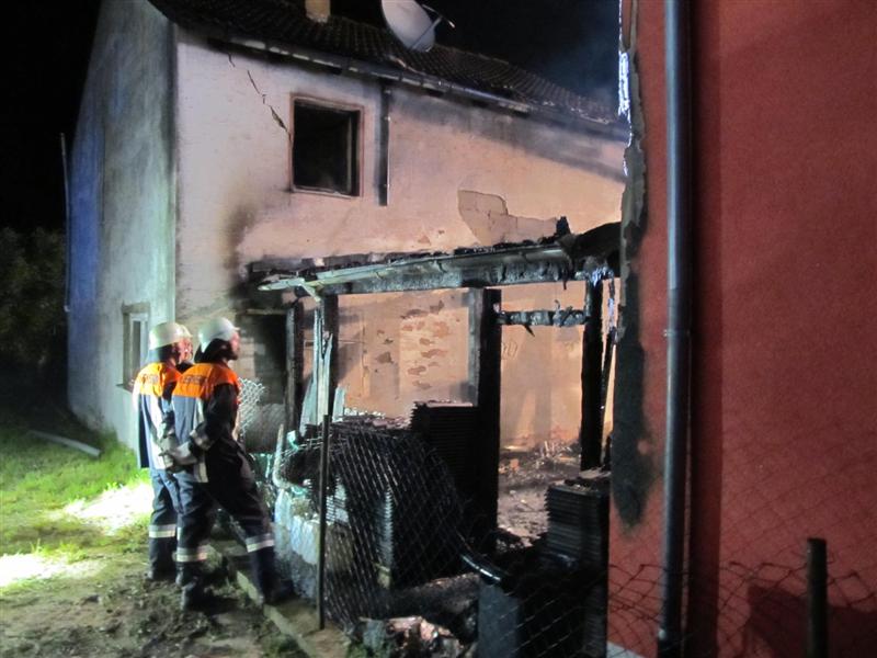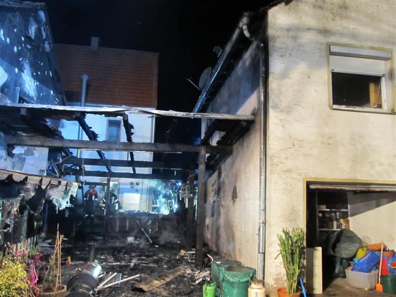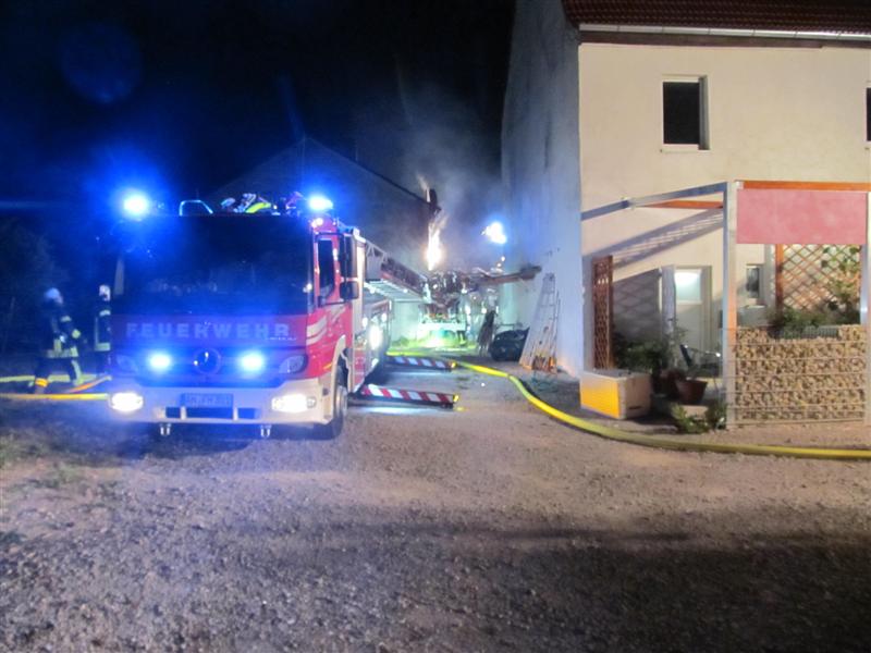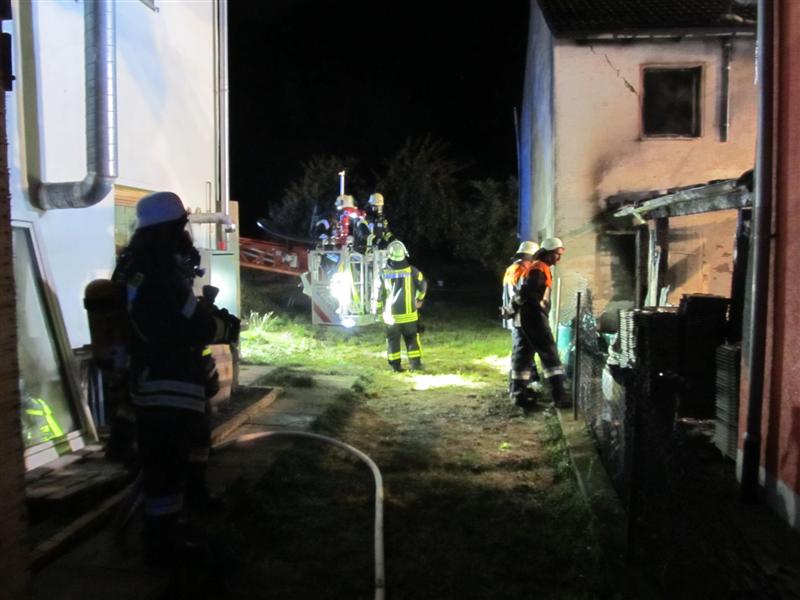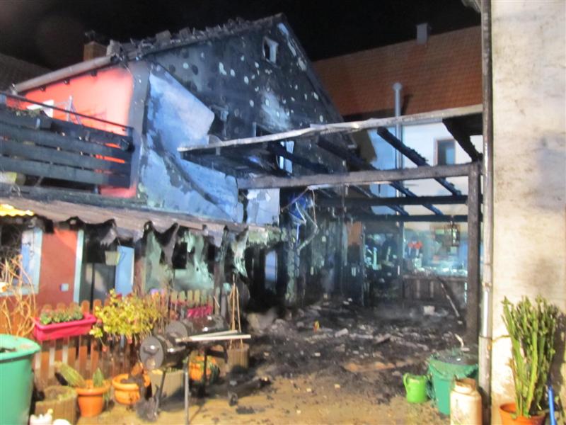 Bereits auf der Anfahrt war eine von Weitem sichtbare Feuer- und Rauchsäule erkennbar. Bei Eintreffen stand ein zwischen zwei Wohnhäusern errichteter Holzverbau in Vollbrand, der Vollwärmeschutz eines Gebäudes brannte auf der kompletten Giebelseite. Flammen schlugen in die Dachstühle.