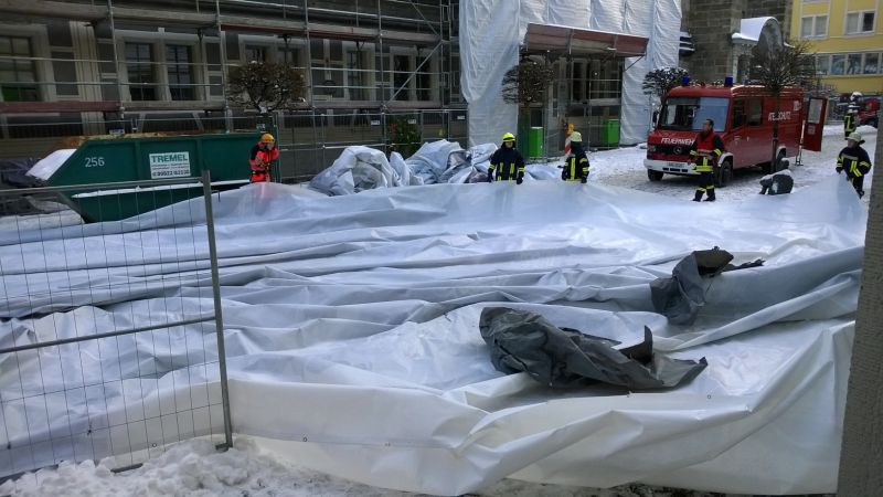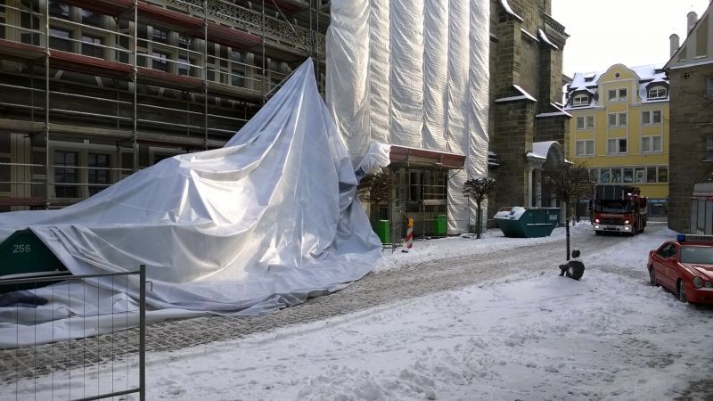 Beim Eintreffen der Feuerwehr stellte sich heraus, dass sich eine sehr große Schutzfolie zur Abdeckung des Gerüsts teilweise gelöst hatte. Zum Schutz vorbeilaufender Passanten wurde die Folie seitens der Feuerwehr restlos entfernt.