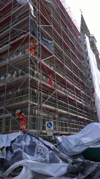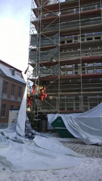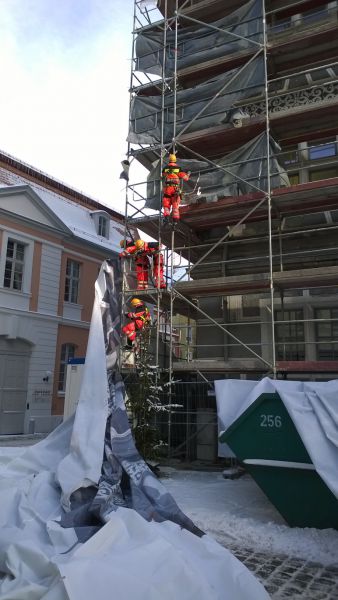 Zum Einsatz kam dabei unter anderem auch die Höhenrettungsgruppe, die mit der Demontage der Folie in den größeren Höhen des Gerüsts beauftragt wurde.