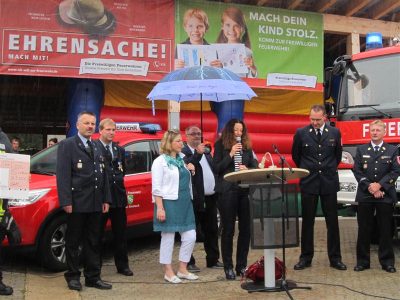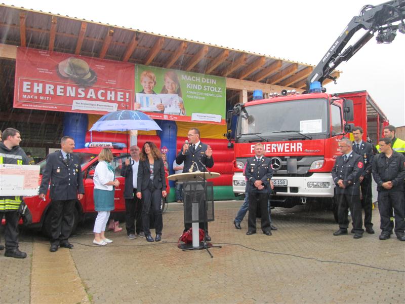 Die Fahrzeugübergabe eines LKW mit Ladekran und eines neuen Kommandowagens durch Frau Oberbürgermeisterin Carda Seidel erfolgte leider genau während einem Regenschauer, trotzdem verfolgten viele Interessierte die kurze Zeremonie, bei der auch das neue Carport der Feuerwache offiziell eingeweiht wurde.
