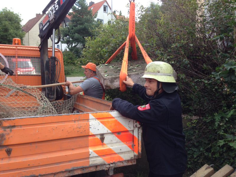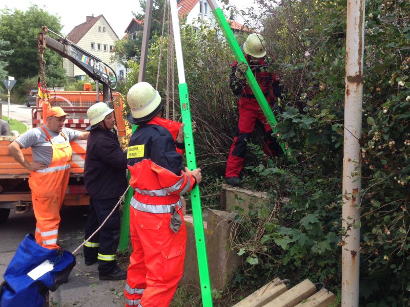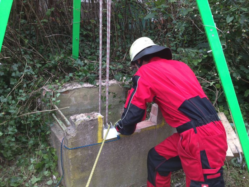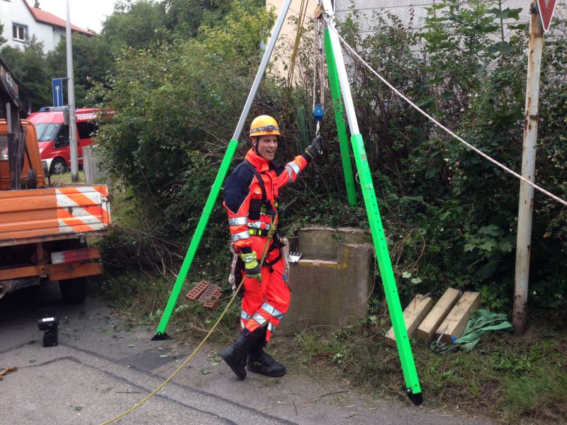 Letztlich wurde die Höhenrettung alarmiert und bis zu deren Eintreffen gemeinsam mit dem Betriebsamt eine Betonabdeckung über dem Schacht entfernt.