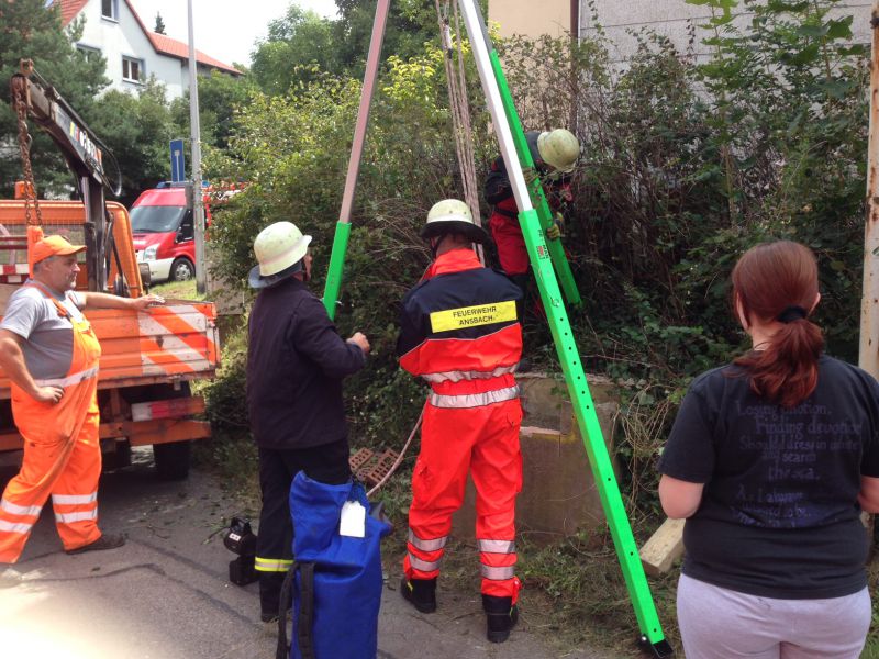 Ein Retter wurde am Dreibein mittels Flaschenzug abgelassen und konnte die Katze kurze Zeit später sicher an die Oberfläche bringen, wo sie freudig in Empfang genommen wurde.