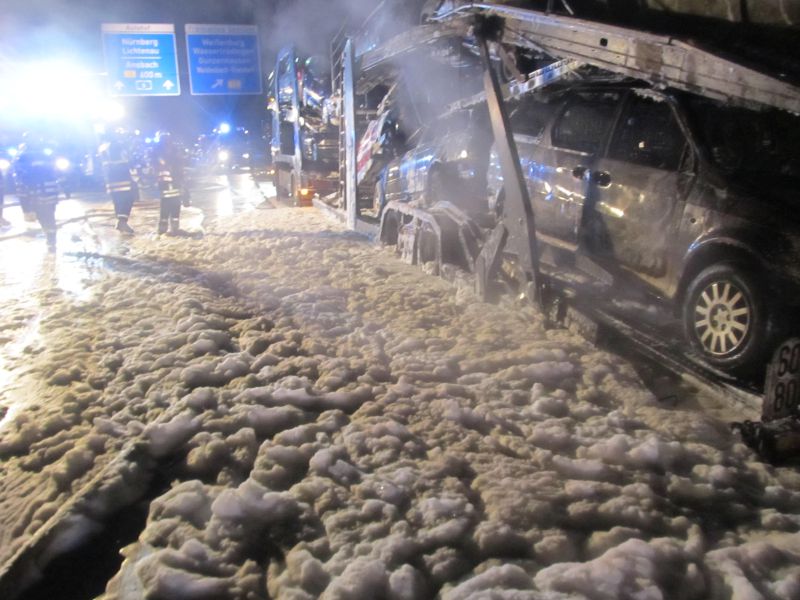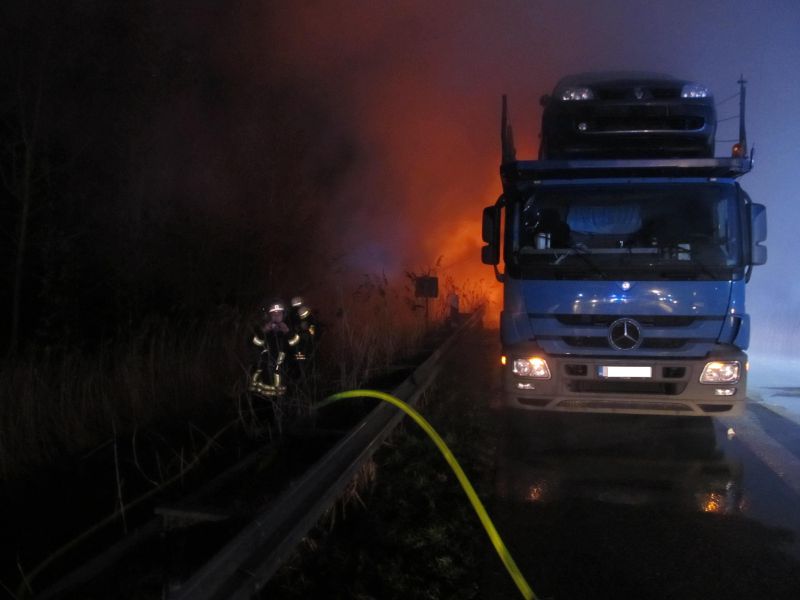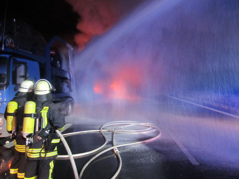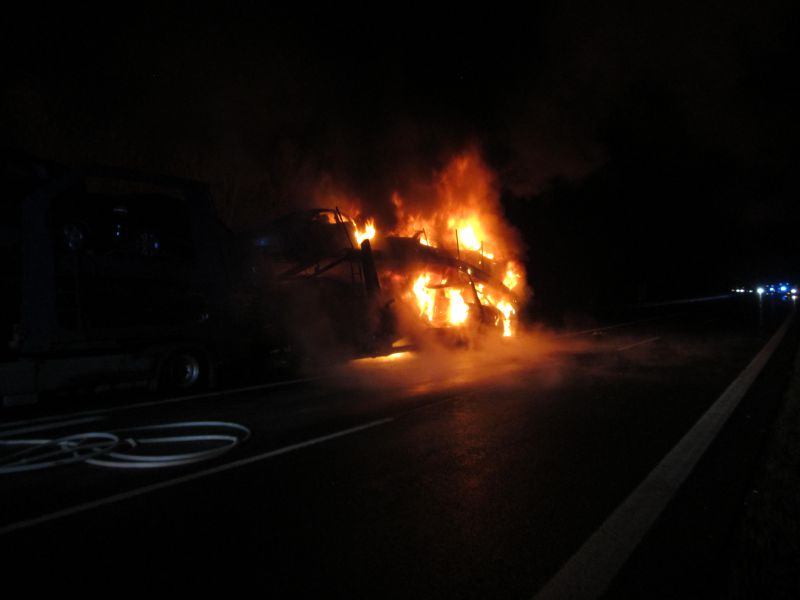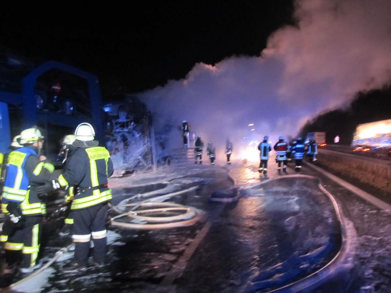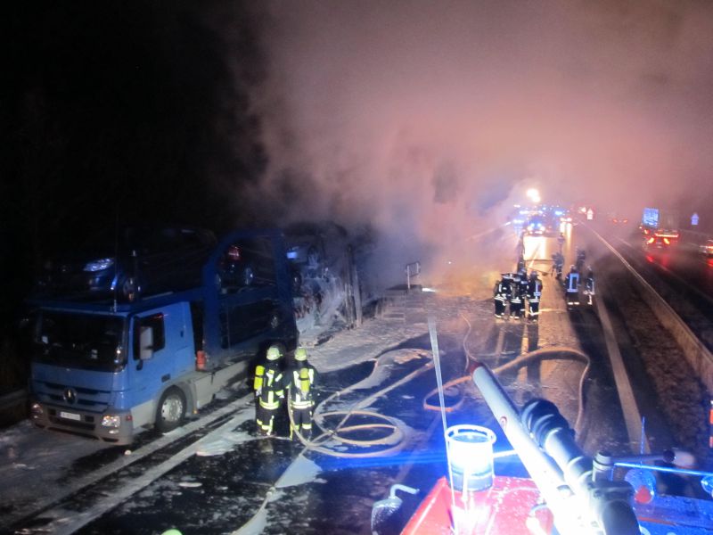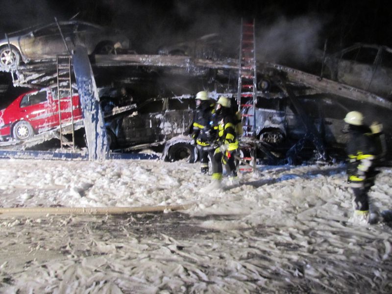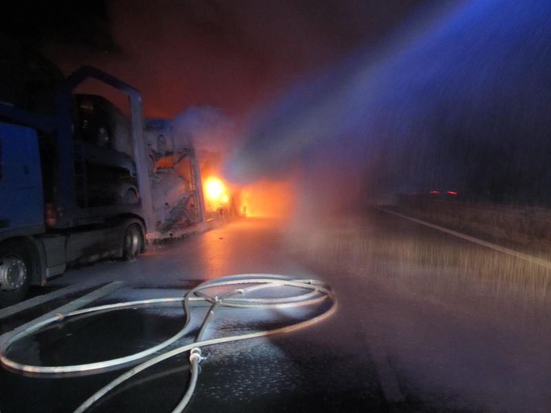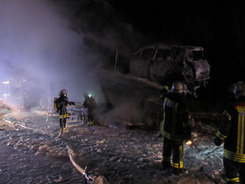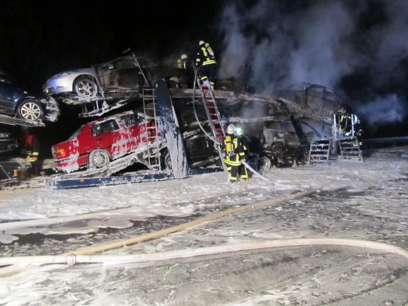 Beim Eintreffen der ersten Fahrzeuge stand ein mit Gebrauchtwagen beladener LKW im Vollbrand.