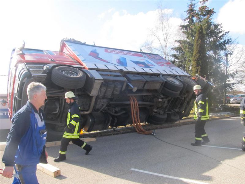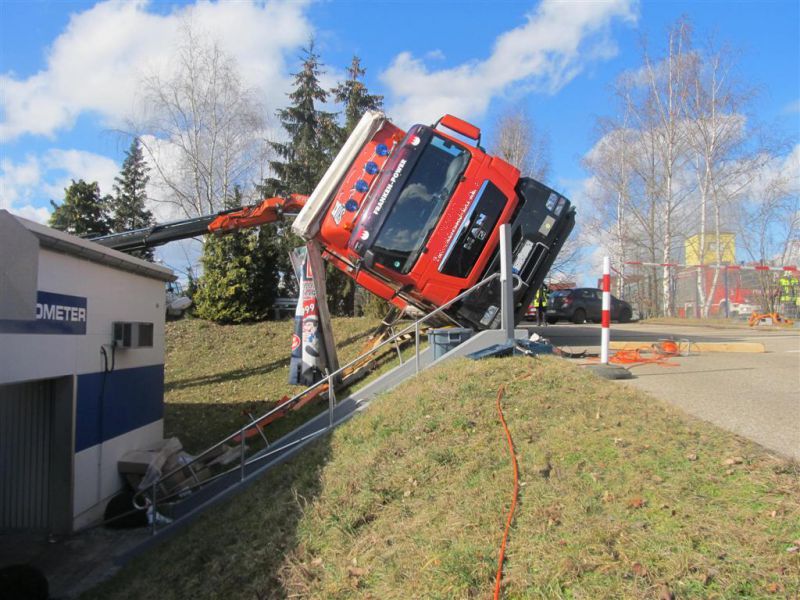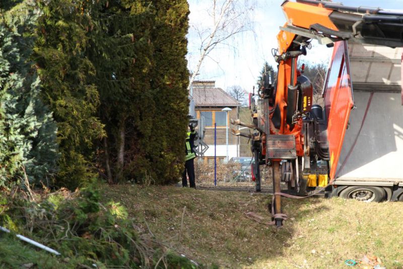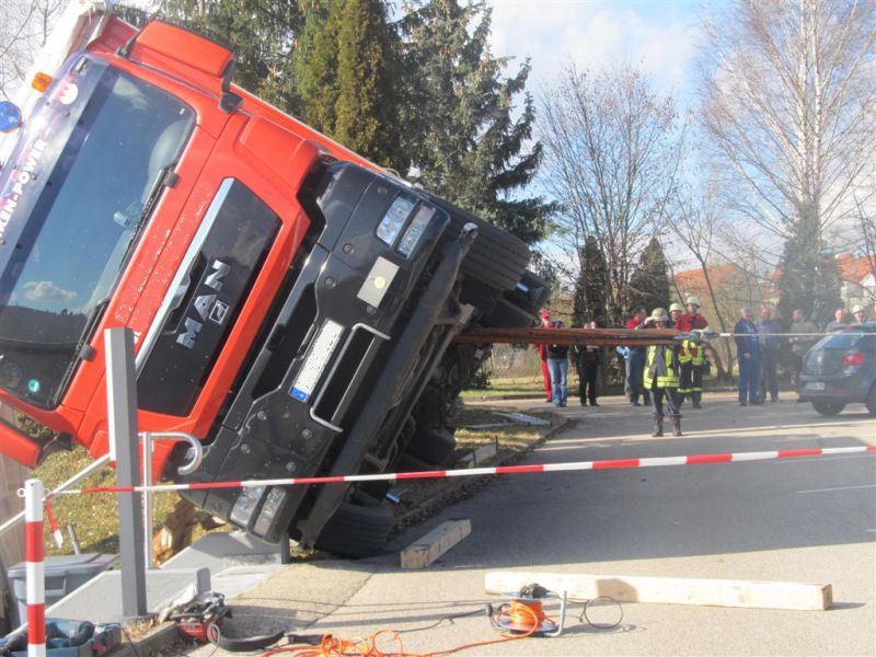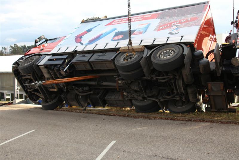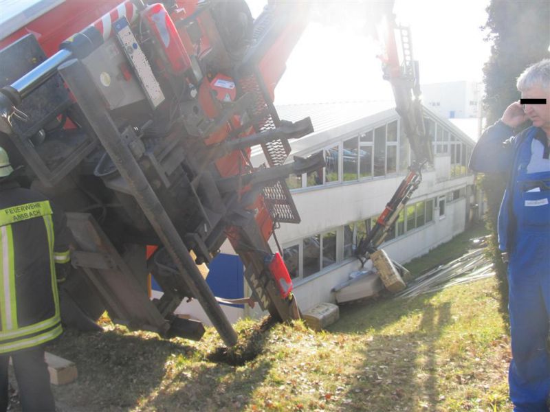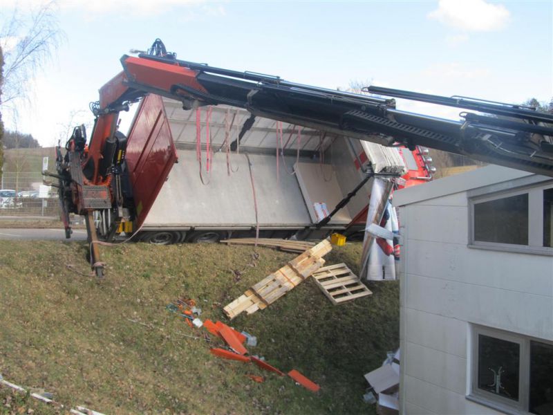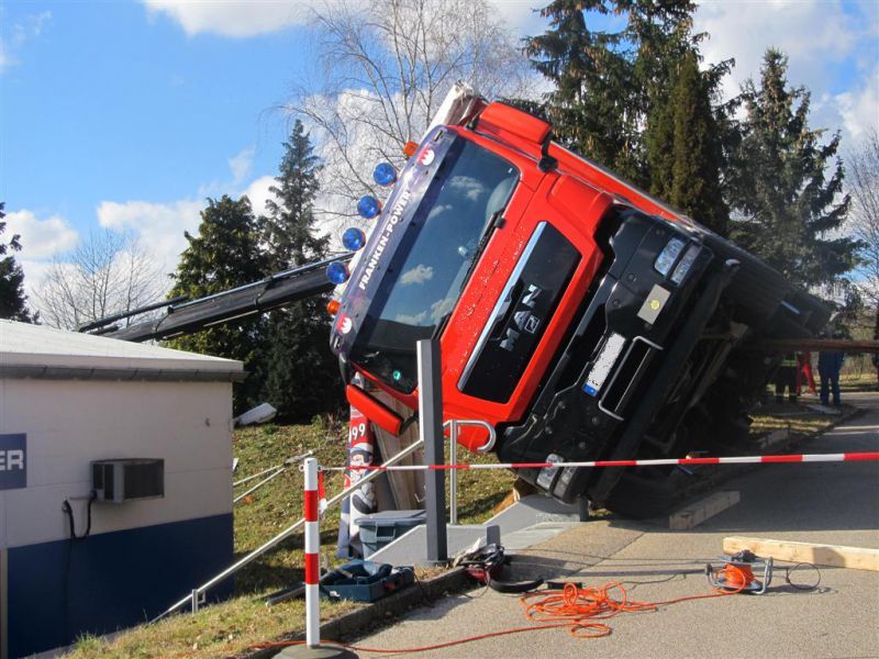Durch die fehlende Abstützung kippte der LKW mit ausgefahrenem Kran seitlich ab und drohte eine Böschung hinabzurutschen und in ein Gebäude zu stürzen. Es kamen dabei glücklicherweise keine Menschen zu Schaden.