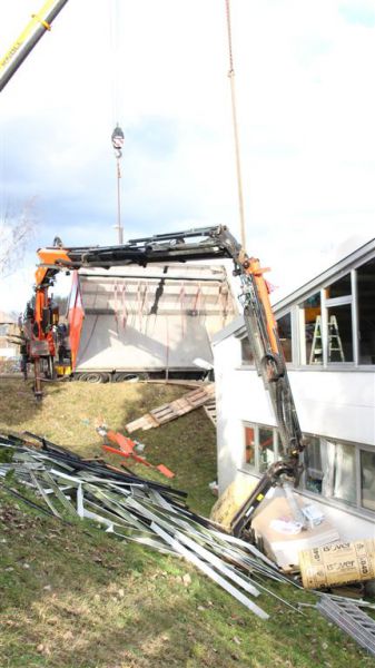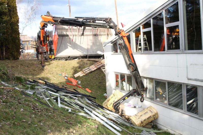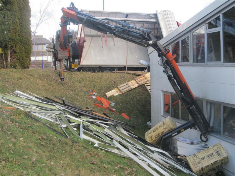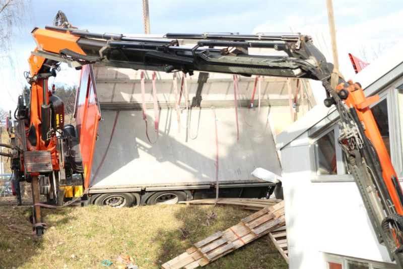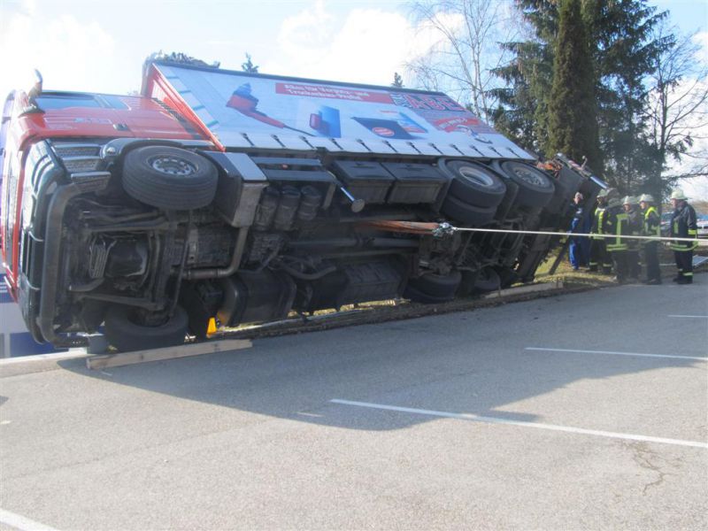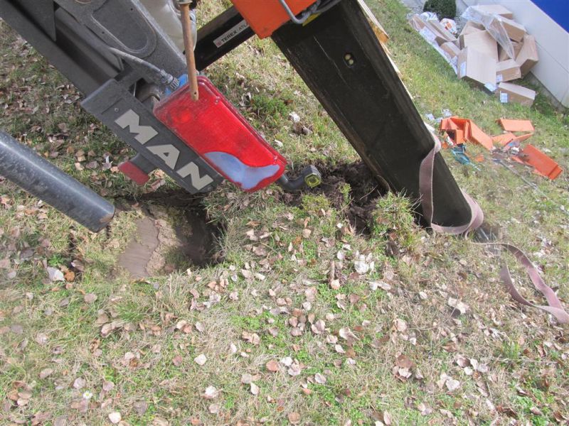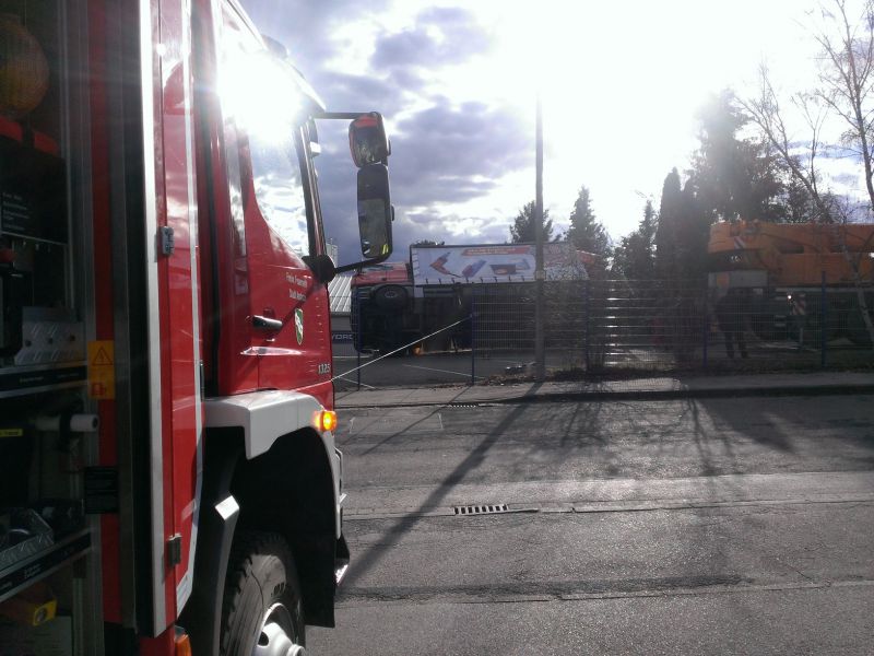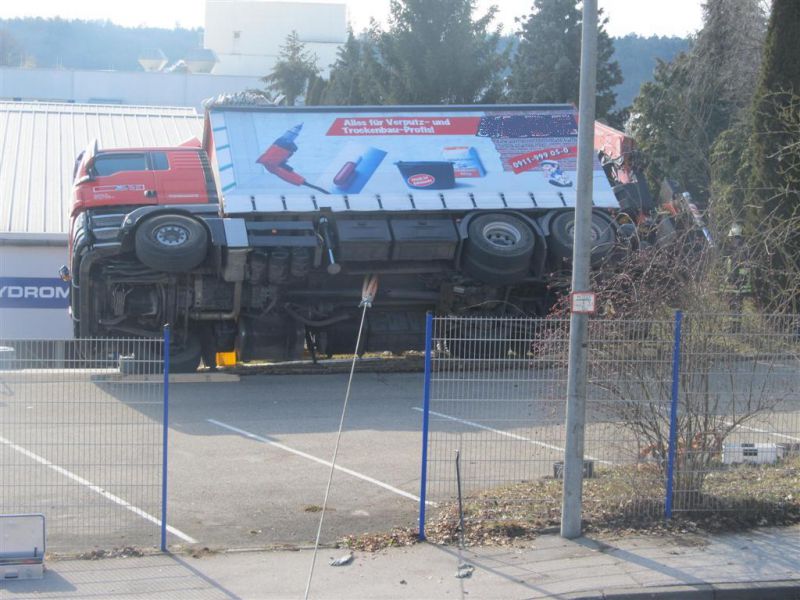 Durch die fehlende Abstützung kippte der LKW mit ausgefahrenem Kran seitlich ab und drohte eine Böschung hinabzurutschen und in ein Gebäude zu stürzen. Es kamen dabei glücklicherweise keine Menschen zu Schaden.