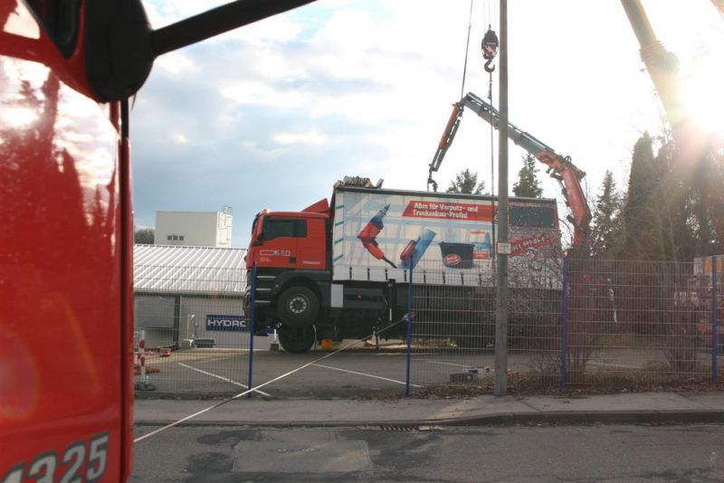 Ein Techniker des LKW-Aufbauers war vor Ort, um in Absprache mit der Bergungsfirma weitere Schäden durch die Hebemaßnahmen zu vermeiden.
