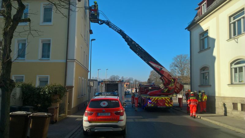 Gegen 12:00 Uhr wurde die Höhenrettungsgruppe zusammen mit der Drehleiter aus Katterbach in die Brauhausstraße zu einer Personenrettung aus dem dritten Obergeschoss alarmiert. Nach gelungener Rettung wurde die Person mit einem Rettungswagen auf die Feuerwache gefahren und dort in den Rettungshubschrauber Christoph 65 umgelagert.