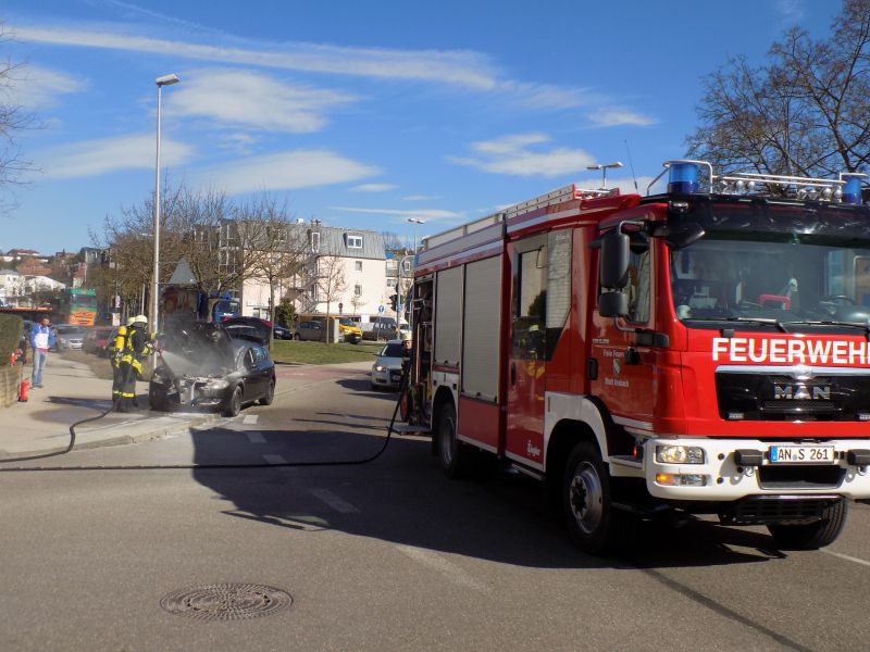 Vor Ort wurde ein aus unbekannter Ursache im Motorraum in Brand geratener Pkw vorgefunden. Ein Trupp unter schwerem Atemschutz konnte das Feuer schnell mittels Schnellangriff ablöschen.