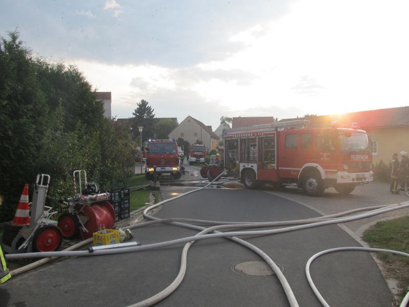 Die Wasserversorgung konnte aus einem nahen Weiher sichergestellt werden. Es wurden mehrere Schlauchstrecken vom offenen Gewässer zu den Einsatzfahrzeugen aufgebaut. Die Drehleiterbesatzung deckte mit dem Wenderohr teile der Scheunenbedachung ab und führt Löschmaßnahmen durch.
