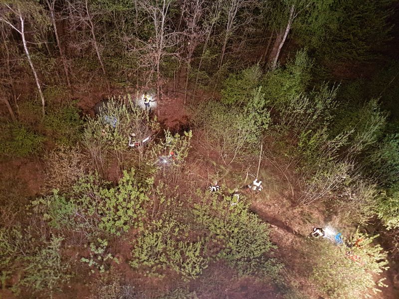 Das unwegsame Gelände und der dichte Bewuchs stellten dabei die Rettungskräfte vor eine besondere Herausforderung. Um die Rettung der Patienten zu ermöglichen, mussten mittels zweier Kettensägen eine Reihe von Bäumen gefällt werden.