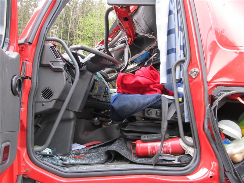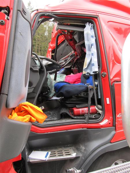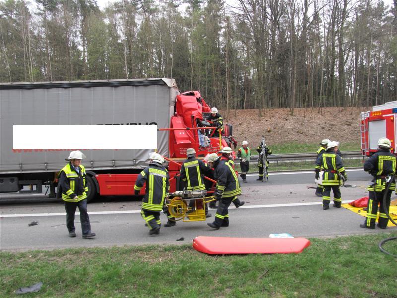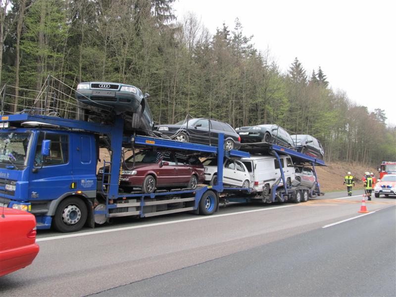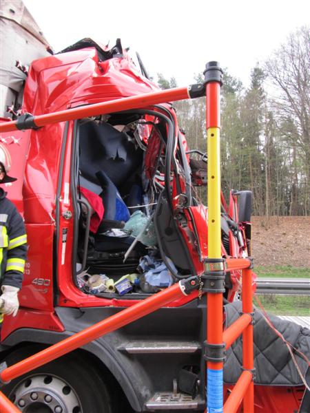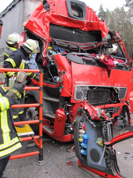 Dort war ein Sattelzug auf einen Autotransporter aufgefahren. Dabei wurde der Fahrer des Sattelzuges schwer eingeklemmt.