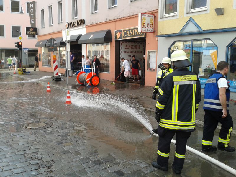 Der Kirchweihbaum im Stadtteil Eyb musste mit dem Ladekran des neu beschafften Versorgungs-LKW der Feuerwehr gegen Absturz gesichert werden. In der Innenstadt wurde eine Person im Keller durch den Wasserdruck eingeschlossen und wurde von der Feuerwehr Ansbach notfallmäßig gerettet. Das Dach der Johanniskirche wurde durch Windböen abgedeckt und musste notdürftig wieder abgedichtet werden. Durch eine Baustelle im Dach des Markgrafenschlosses drang Wasser ein und bedrohte die historischen Räume. Zahlreiche weitere Keller, Tiefgaragen und Schächte mussten ausgepumpt und umgestürzte Bäume beseitigt werden. Wegen des hohen Wasserdruckes wurden Kanaldeckel hochgehoben und weggespült.