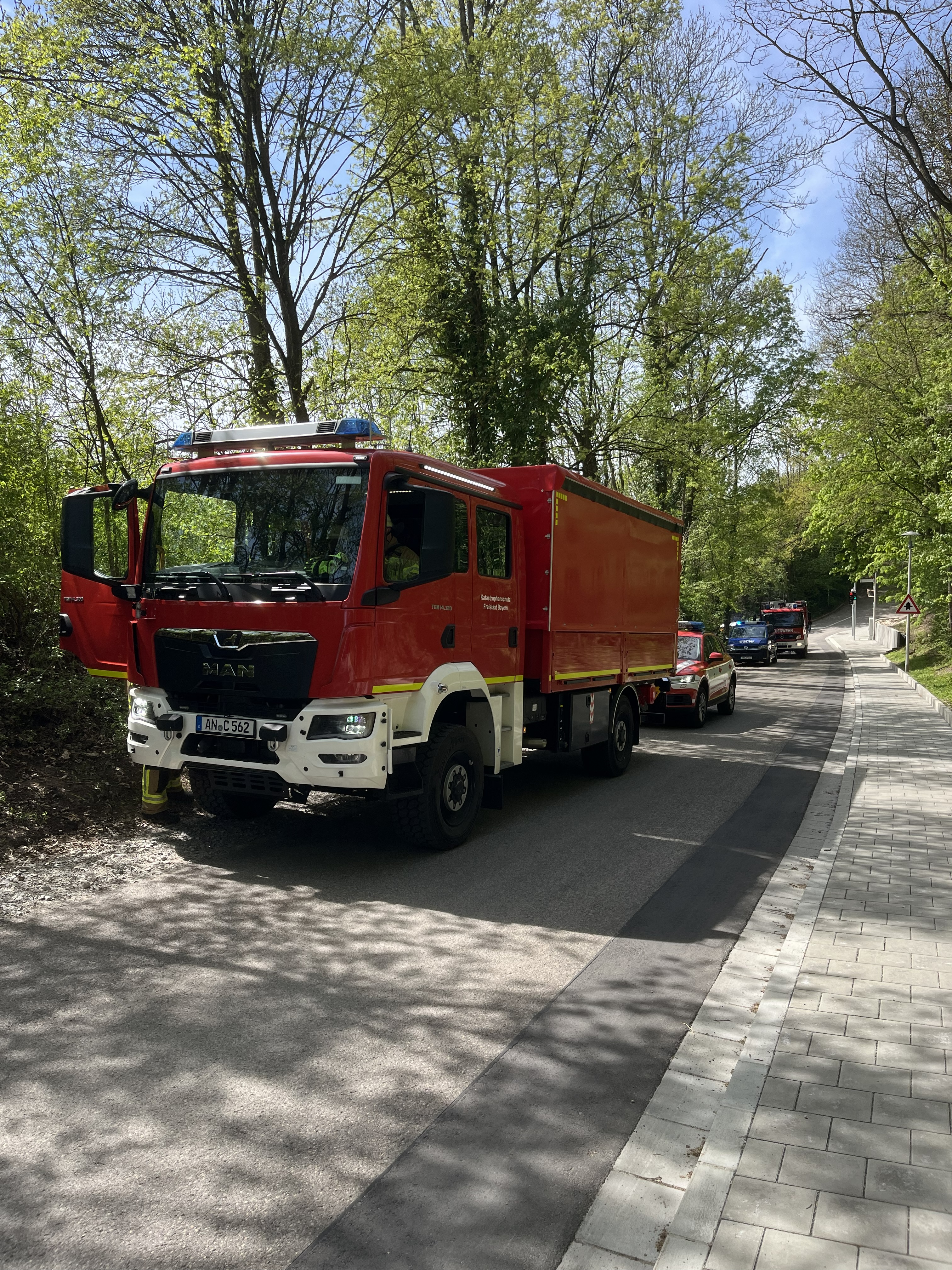 Nach Eintreffen erfolgte die erste Lageerkundung durch die Einsatzleitung mit Kommandowagen (KdoW), sowie der Polizei. Ein Verfügungsraum wurde eingerichtet, in dem sich die anrückenden Einsatzkräfte sammelten. Zur weiteren Lageerkundung aus der Luft kam eine Drohne der Unterstützungsgruppe (UG-Drohne) zum Einsatz.