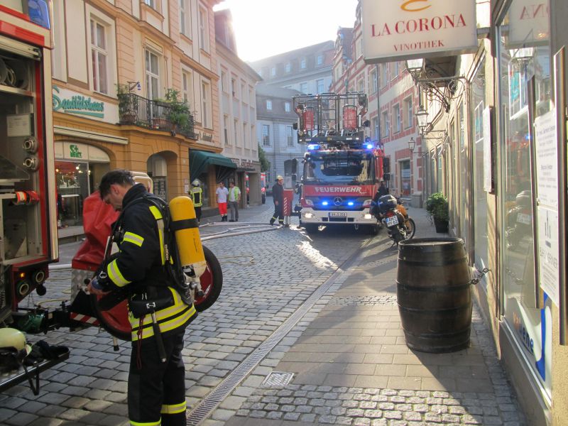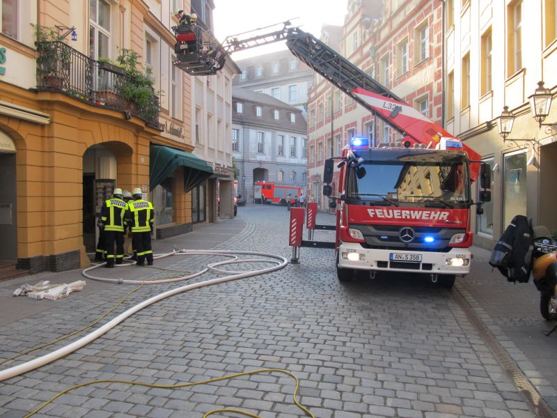 Beim Eintreffen des ersten Fahrzeugs drang Rauch aus der Eingangstür. Umgehend wurde Vollalarm für die Feuerwehr Ansbach ausgelöst. Sofort wurde ein Trupp unter schwerem Atemschutz zur Brandbekämpfung in das Gebäude geschickt.