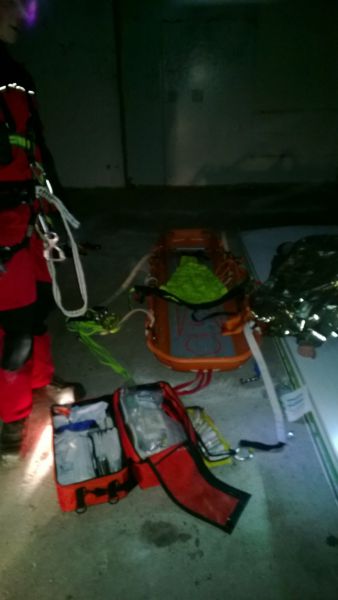 Nach Aufbau eines Dreibeins wurden eine Schaufel- und eine Schleifkorbtrage abgelassen, in der die Verletzte zusammen mit einem Höhenretter aufgezogen wurde.