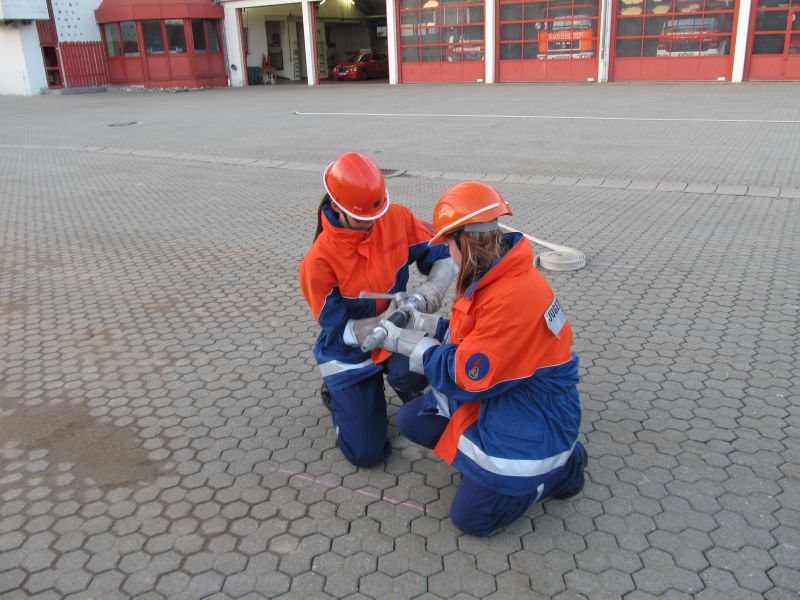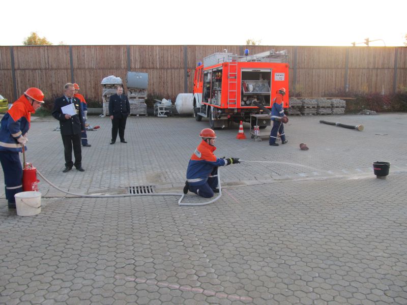 Hierbei mussten sie unter anderem eine Saugleitung kuppeln, einen Brustbund anlegen, eine 90 Meter lange C-Schlauchleitung kuppeln sowie verschiedene Knoten und Stiche beherrschen.