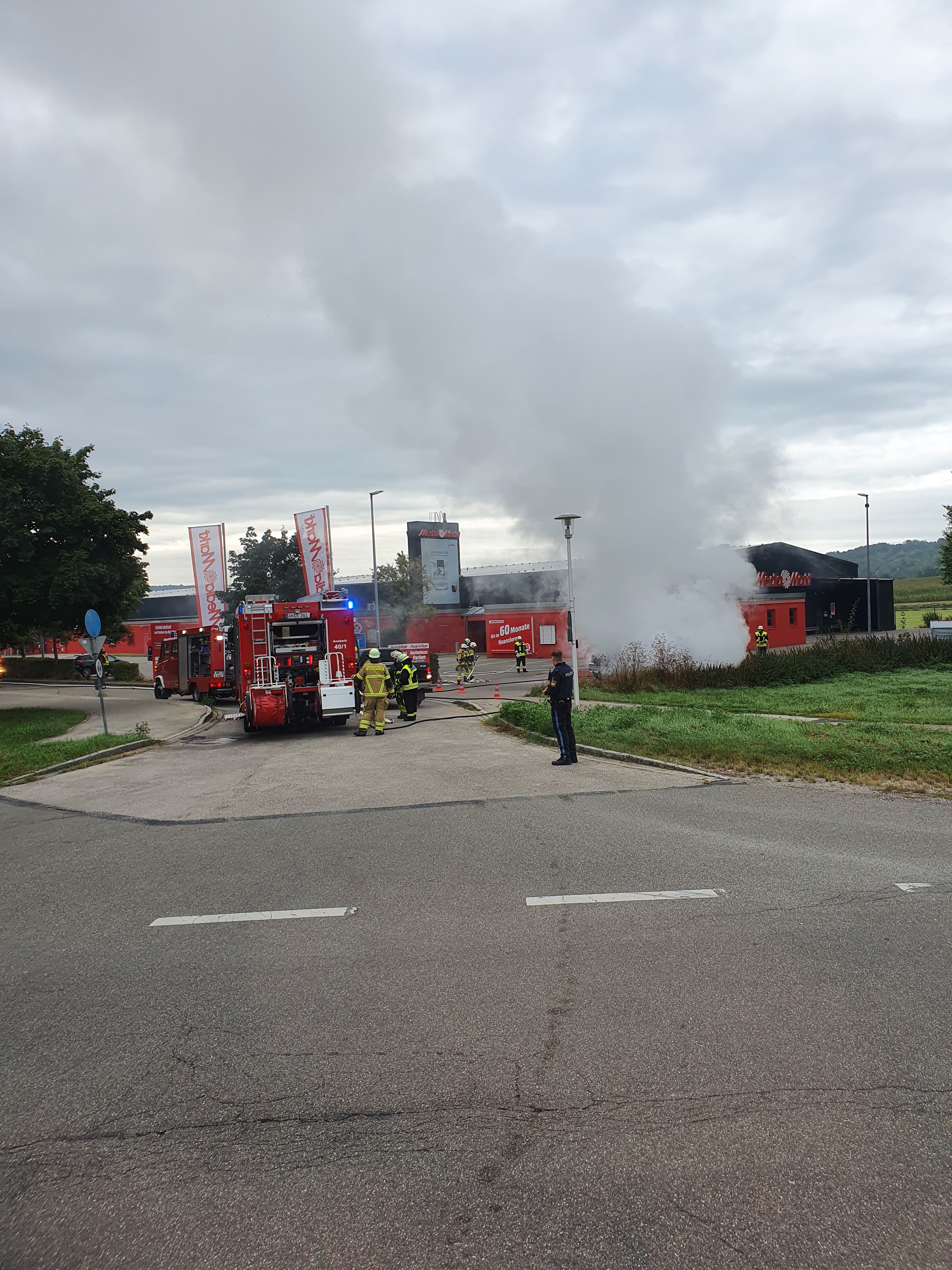Bei Eintreffen der Feuerwehr stand der Motorraum bei einem auf einem Parkplatz abgestellten Pkw in Vollbrand. Durch einen Trupp unter Atemschutz konnte der Brand schnell mit Hilfe eine C-Strahlrohrs abgelöscht werden und eine Ausdehnung des Brandes verhindert werden.