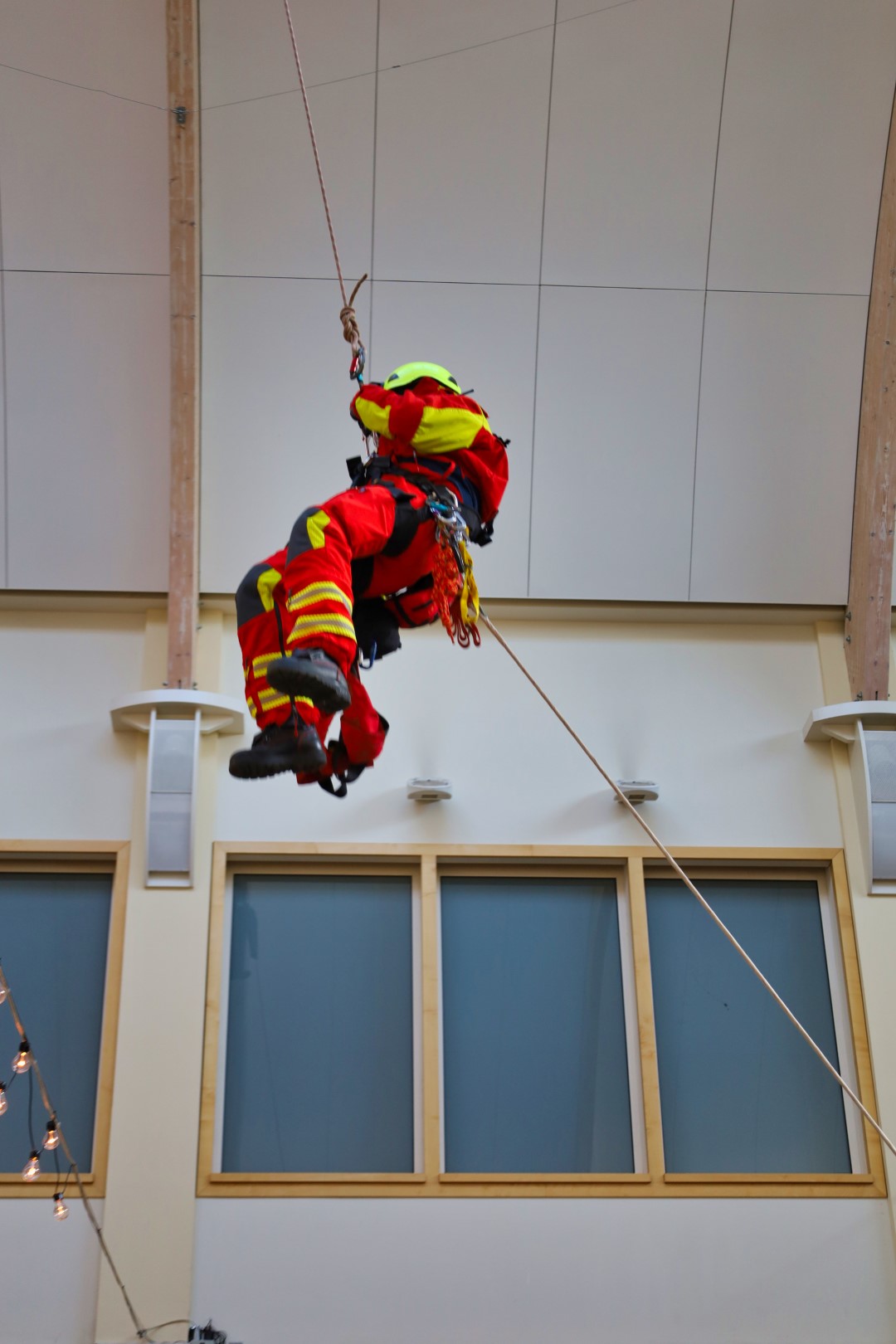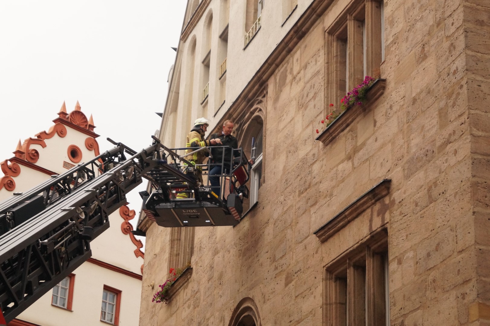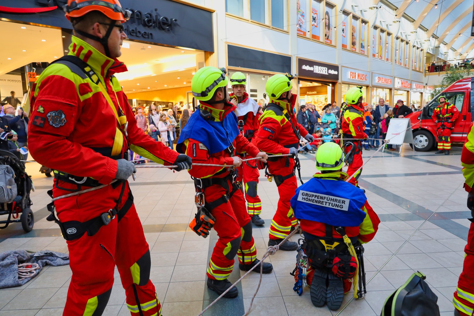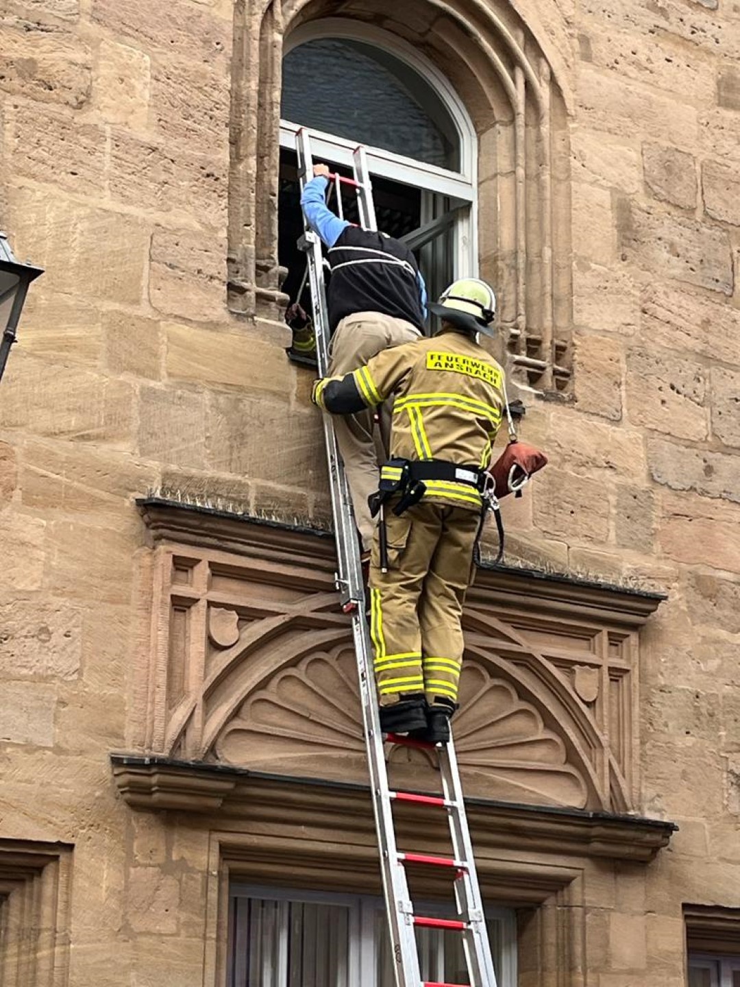 Galt es am Montag den Oberbürgermeister bei einer Brandschutzübung mit der Drehleiter aus dem Amtssitz zu retten, so stürzte am Dienstag, dem 20.09.2022, ein Fensterputzer in luftiger Höhe in der Glaskuppel der „Inneren Ladenstraße“ im Brückencenter ab und musste durch die Höhenrettungsgruppe der Feuerwehr Ansbach aus seiner misslichen Lage befreit werden.