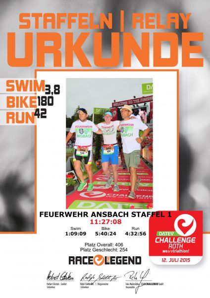 Die Staffel 1 der Feuerwehr Ansbach setzte sich aus Rainer Schwarzbeck (Schwimmer), Tilman Wörrlein (Radfahrer) und Dominik Luksch (Läufer) zusammen. Sie erreichten eine Zeit von 11:27:08 (01:09:09, 05:40:24, 04:32:56).