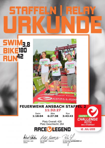 Die Staffel 2 der Feuerwehr Ansbach setzte sich aus Sebastian Graf (Schwimmer), Pascal Mittemeyer (Radfahrer) und Lukas Lechner (Läufer) zusammen. Sie erreichten eine Zeit von 11:32:27 (01:18:04, 06:27:38, 03:43:43).