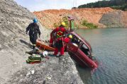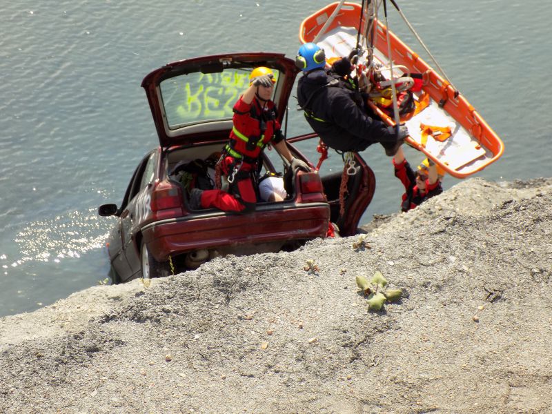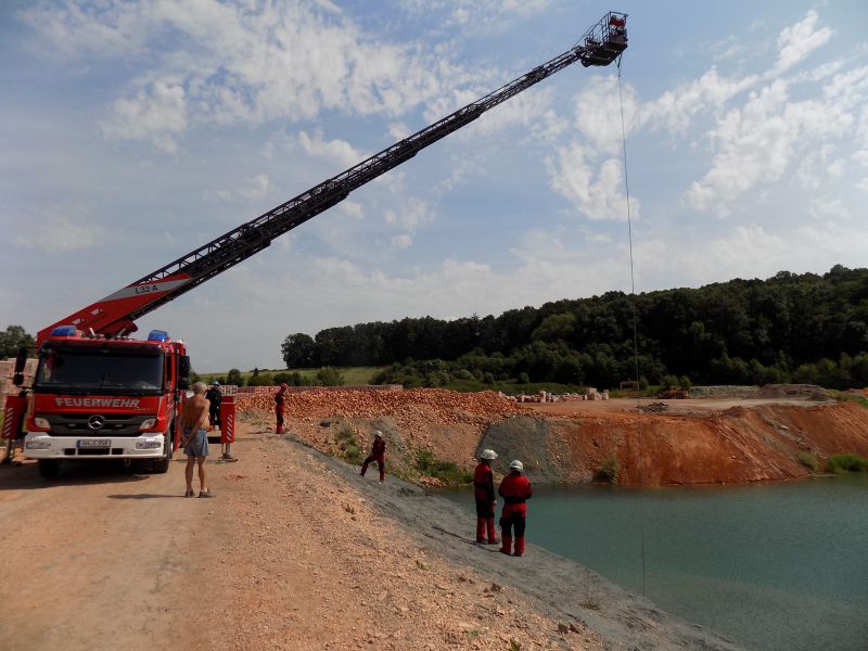 Mittels der Drehleiter wurden sowohl Personal als auch Material auf einen Sims an der Wasserkante gekrant und mussten von dort sowohl die Fahrzeugsicherung als auch die Versorgung und Rettung von Verletzten unter stark erschwerten Bedingungen durchführen.