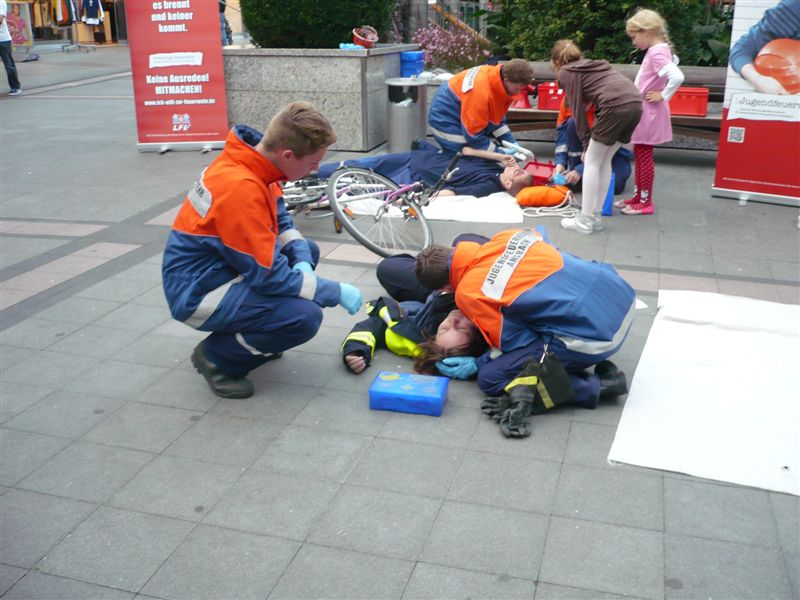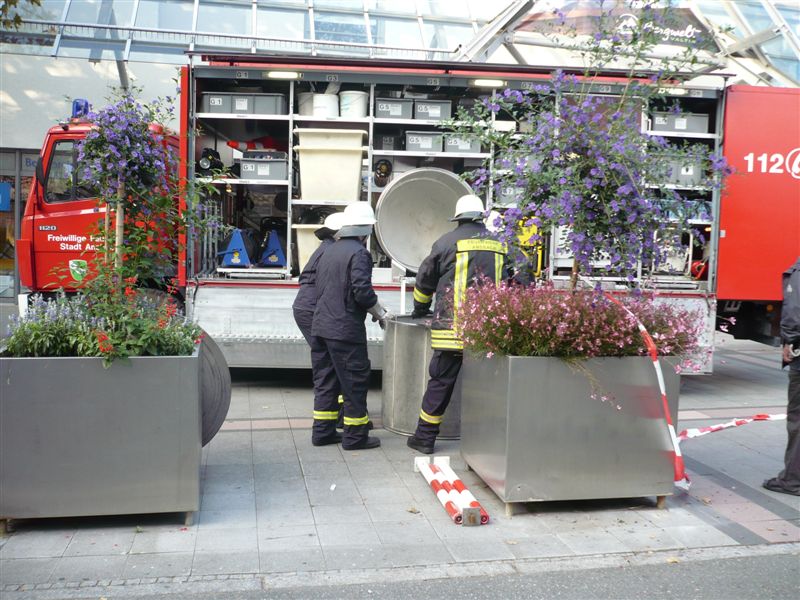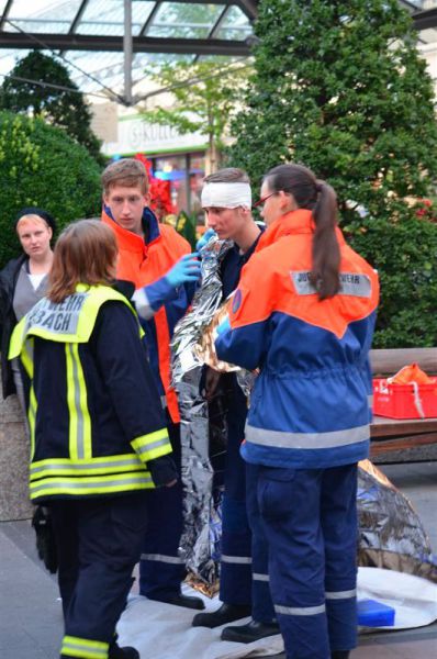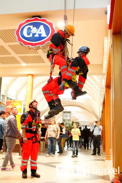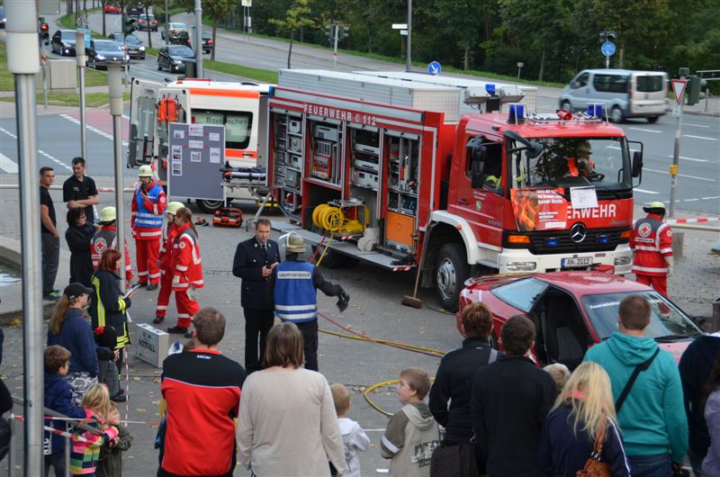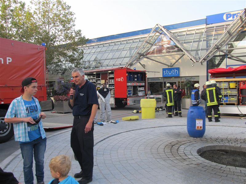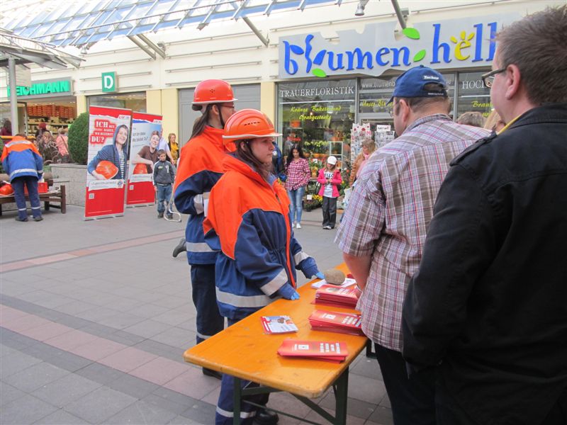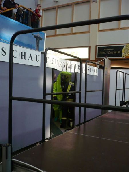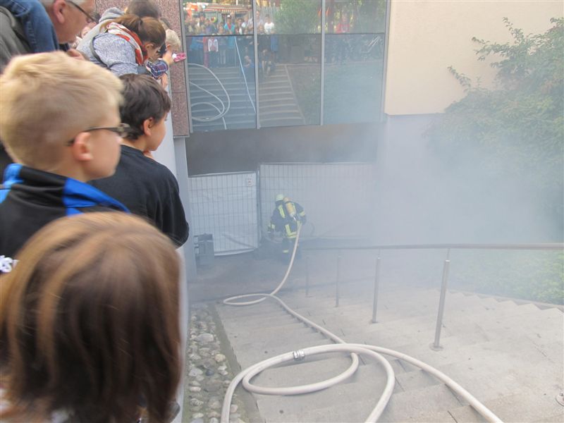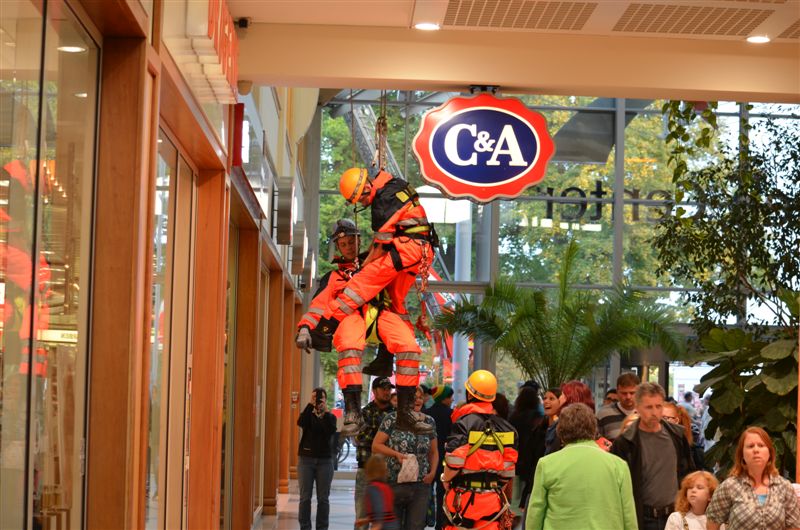 Vom Verkehrsunfall mit eingeklemmten Personen ging es zum Löscheinsatz mit Drehleiter und Atemschutz. Im Innern des Brückencenters zeigte die Höhenrettungsgruppe an der Galerie ihr Können, bevor es an der Bühne zur Feuerwehr-Modenschau verschiedene Einsatzkleidungen zu bestaunen gab. In der außeren Ladenstraße stellte sich die Jugendgruppe vor, die Einsatzleitung informierte über Lagekarten und Funktechnik und das Tanklöschfahrzeug 20/40 zog die Besucher durch den leistungsstarken Dachmonitor in den Bann. Am Brunnen bildete die Dekontaminationseinheit mit dem Gerätewagen Gefahrgut mit ihren Vorführungen den Abschluss der Stationsreihe.