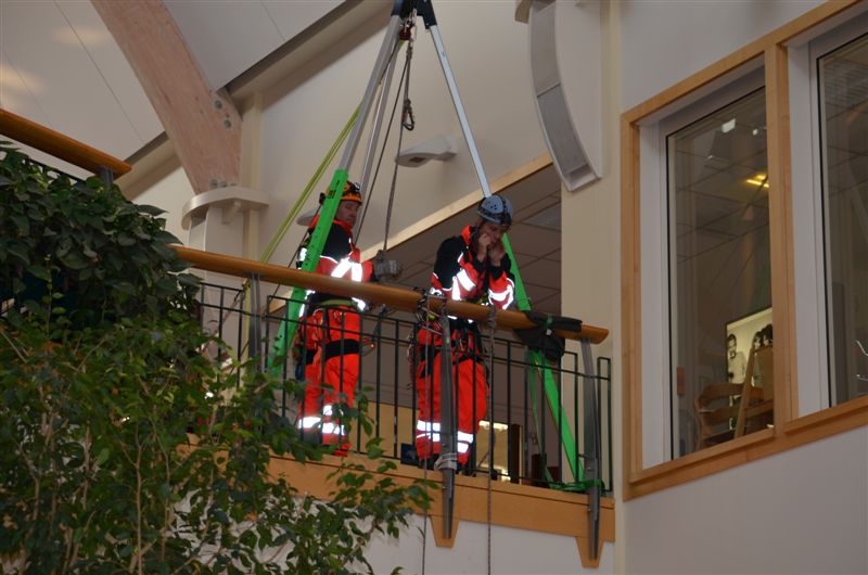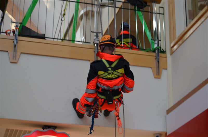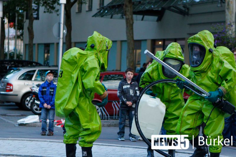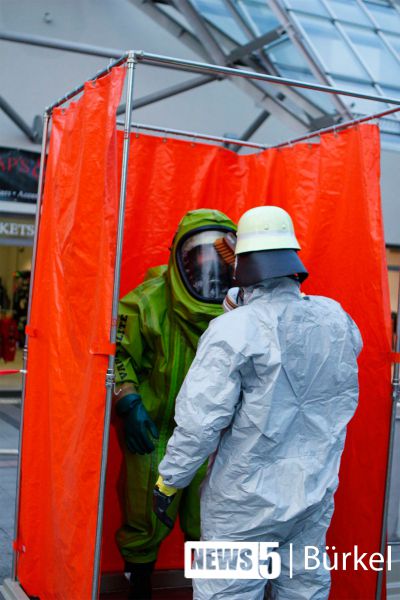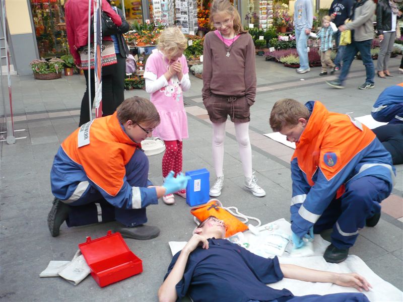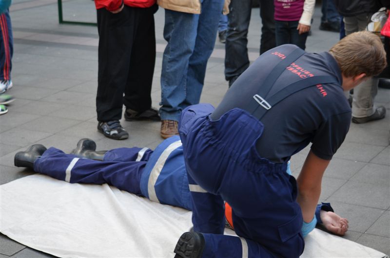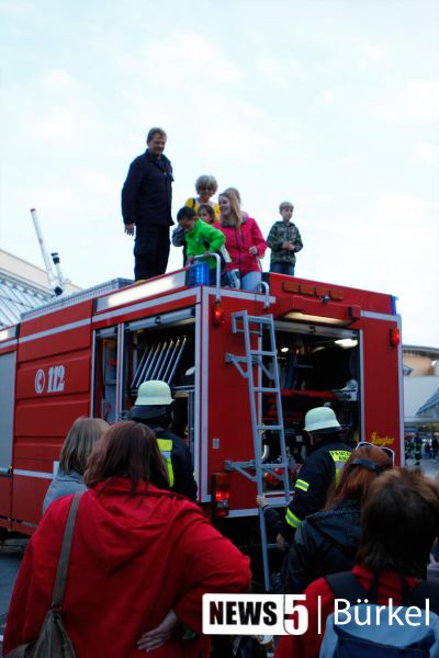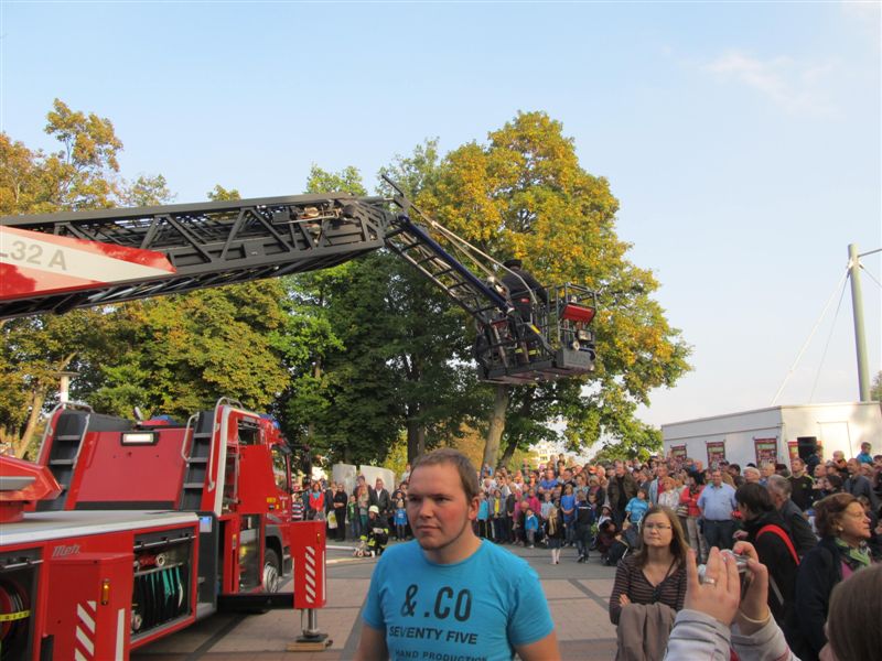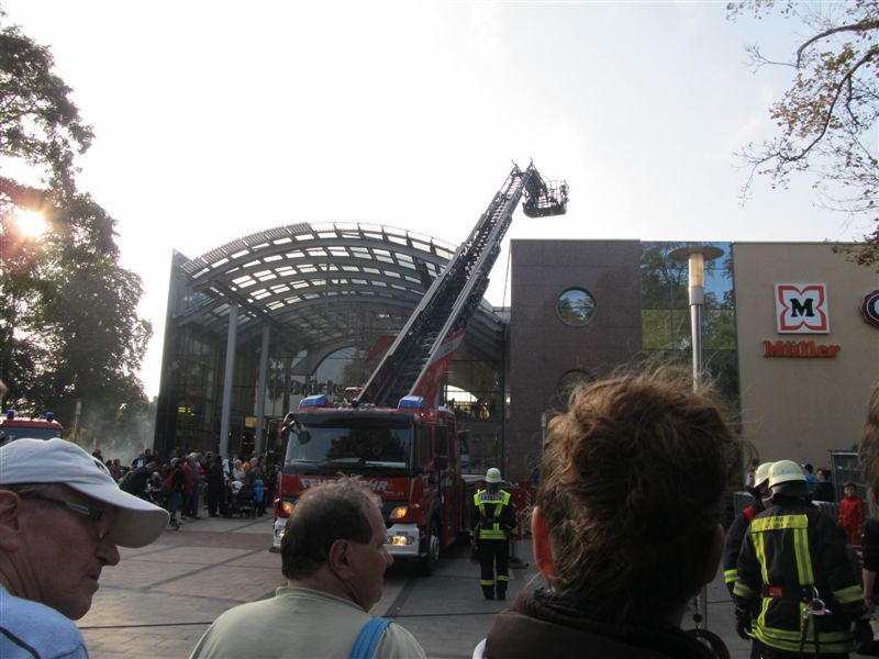 Vom Verkehrsunfall mit eingeklemmten Personen ging es zum Löscheinsatz mit Drehleiter und Atemschutz. Im Innern des Brückencenters zeigte die Höhenrettungsgruppe an der Galerie ihr Können, bevor es an der Bühne zur Feuerwehr-Modenschau verschiedene Einsatzkleidungen zu bestaunen gab. In der außeren Ladenstraße stellte sich die Jugendgruppe vor, die Einsatzleitung informierte über Lagekarten und Funktechnik und das Tanklöschfahrzeug 20/40 zog die Besucher durch den leistungsstarken Dachmonitor in den Bann. Am Brunnen bildete die Dekontaminationseinheit mit dem Gerätewagen Gefahrgut mit ihren Vorführungen den Abschluss der Stationsreihe.