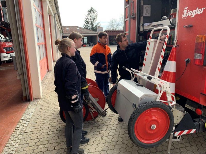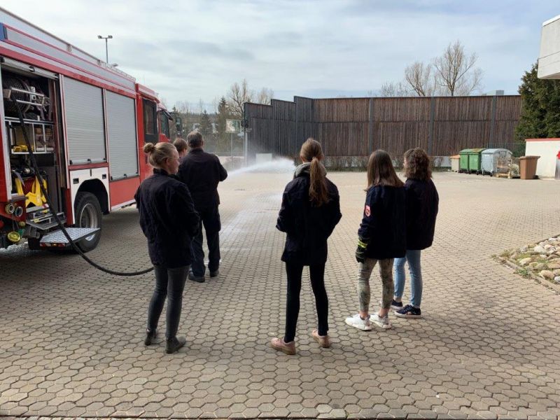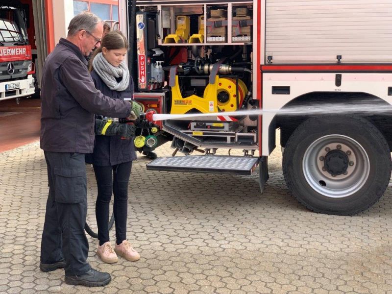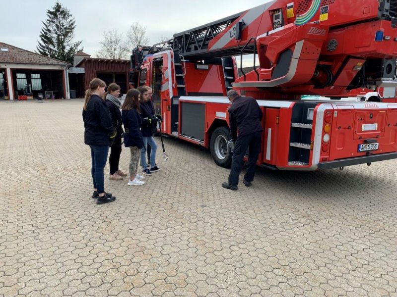 Zuerst wurde ein Löschangriff aufgebaut, dann durften die Schülerinnen mit der Drehleiter mitfahren. Im weiteren Verlauf konnte sich die Gruppe anschauen, wie schwere Lasten durch die Feuerwehr angehoben werden können.