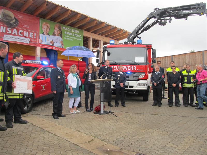 Die Fahrzeugübergabe eines LKW mit Ladekran und eines neuen Kommandowagens durch Frau Oberbürgermeisterin Carda Seidel erfolgte leider genau während einem Regenschauer, trotzdem verfolgten viele Interessierte die kurze Zeremonie, bei der auch das neue Carport der Feuerwache offiziell eingeweiht wurde.