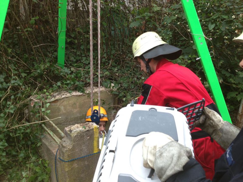 Letztlich wurde die Höhenrettung alarmiert und bis zu deren Eintreffen gemeinsam mit dem Betriebsamt eine Betonabdeckung über dem Schacht entfernt.