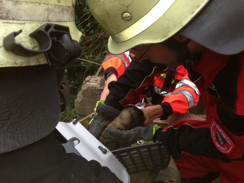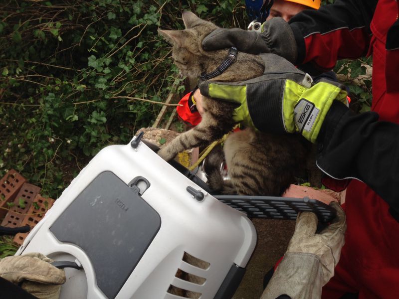 Ein Retter wurde am Dreibein mittels Flaschenzug abgelassen und konnte die Katze kurze Zeit später sicher an die Oberfläche bringen, wo sie freudig in Empfang genommen wurde.