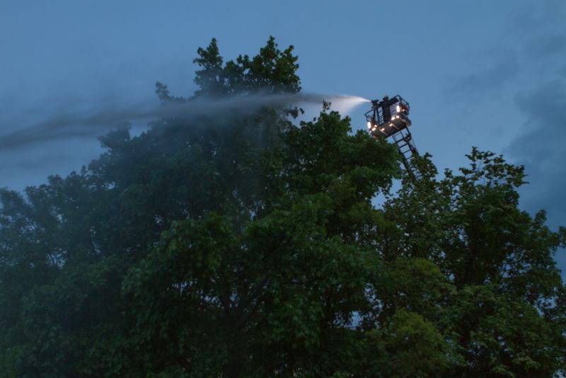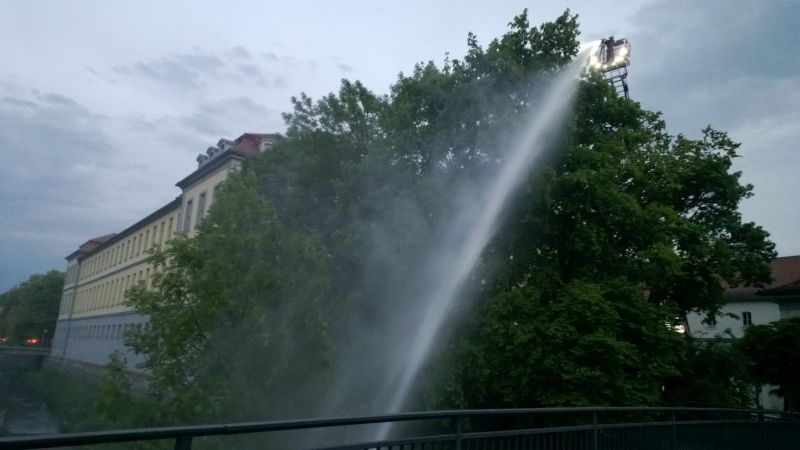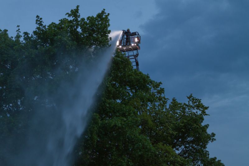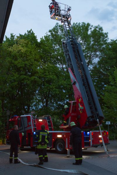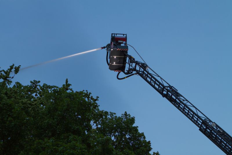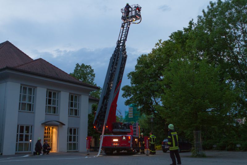 Nach Anleiterübungen an Dachgauben und Fensterfronten wurde zum Schluss das Wenderohr der Drehleiter mit Wasser versorgt.