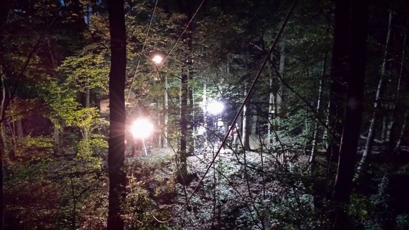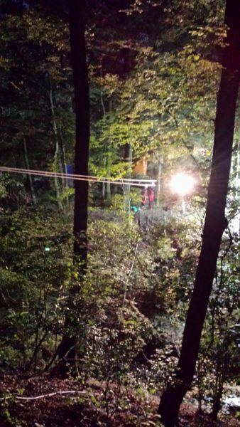 Bei einsetzender Dunkelheit wurde der Mannschaft die Aufgabe gestellt, in einem Waldstück hinter einer Zimmerei eine Person mit vermuteter Beinfraktur möglichst schonend über die dortige, schwer begehbare, Schlucht zu transportieren.