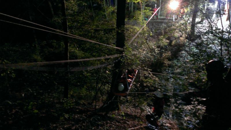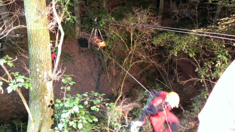 Ein Mitglied der Höhenrettung übernahm die Erstversorgung und Betreuung des Verletzten, während beiderseits der Schlucht Festpunkte gebaut, sowie Trag- und Zugseile für die Schleifkorbtrage vorbereitet wurden.