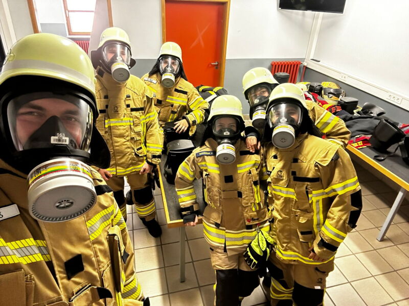 Den größten Teil des Lehrgangs nahm allerdings die praktische Ausbildung in Anspruch. Nach einer Einweisung in die Handhabung und den Umgang mit Filtergeräten und Pressluftatmern ging es zu Gewöhnungsübungen mit jeweils gesteigertem Schwierigkeits- und Belastungsgrad. Auch das Aufsuchen und Retten von Personen aus verqualmten Räumen sowie Notfalltraining und Umgang mit Gefahrensituationen stand auf dem Programm.