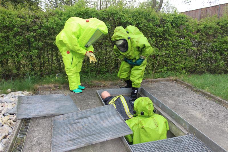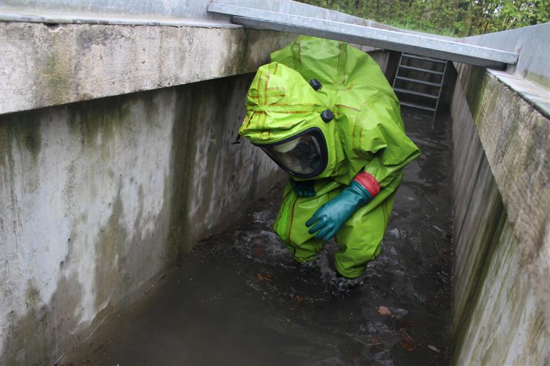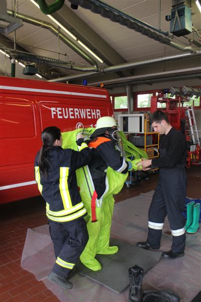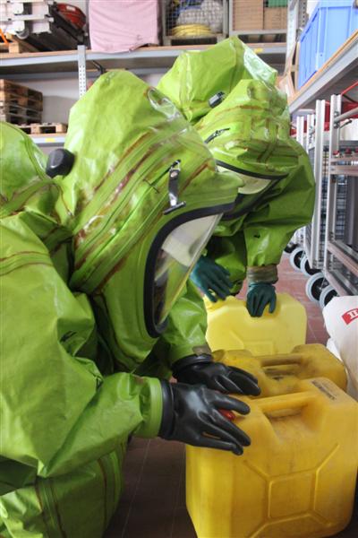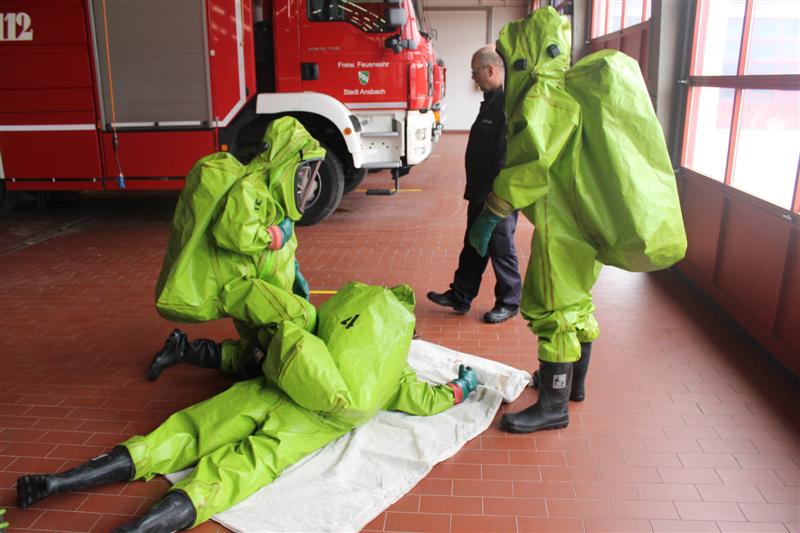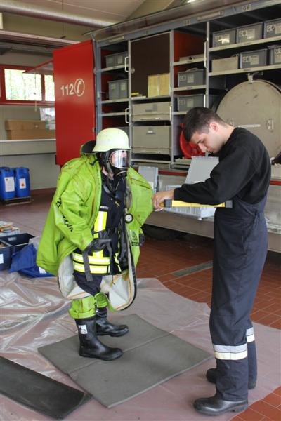 Schritt für Schritt führten die Ausbilder die künftigen Träger von Chemikalienschutzanzügen (CSA) an den Umgang mit dem neuen Ausrüstungsteil heran. Nach einem kurzen theoretischen Teil ging es gleich an die praktische Handhabung gefolgt von Gewöhnungsübungen. Auch Notfallmaßnahmen wurden geschult. Eine realitätsnah dargestellte Einsatzübung forderte den „Neuen“ nochmal Ihr ganzes Wissen hinsichtlich Handhabung, Vorgehensweise und Einsatztaktik ab und verdeutlichte ein weiteres Mal die anstrengende Arbeit bei eingeschränktem Bewegungsablauf und Sichtfeld.