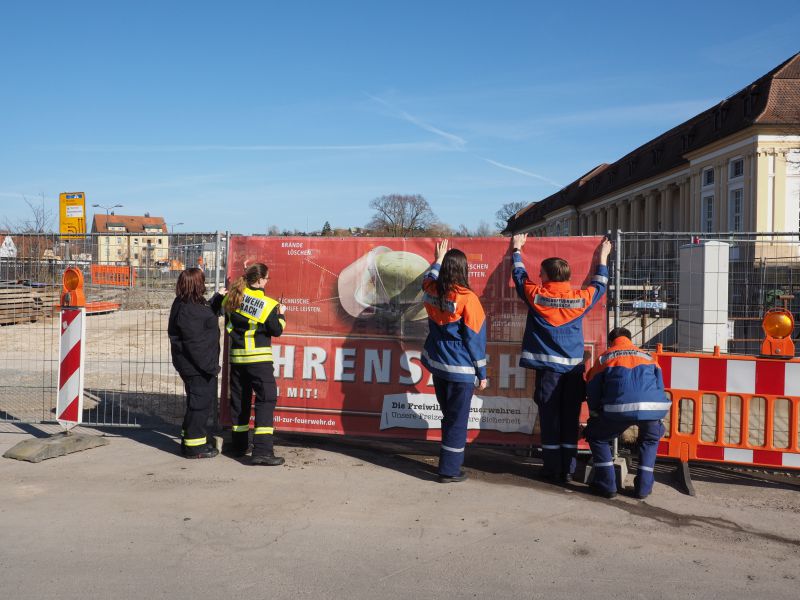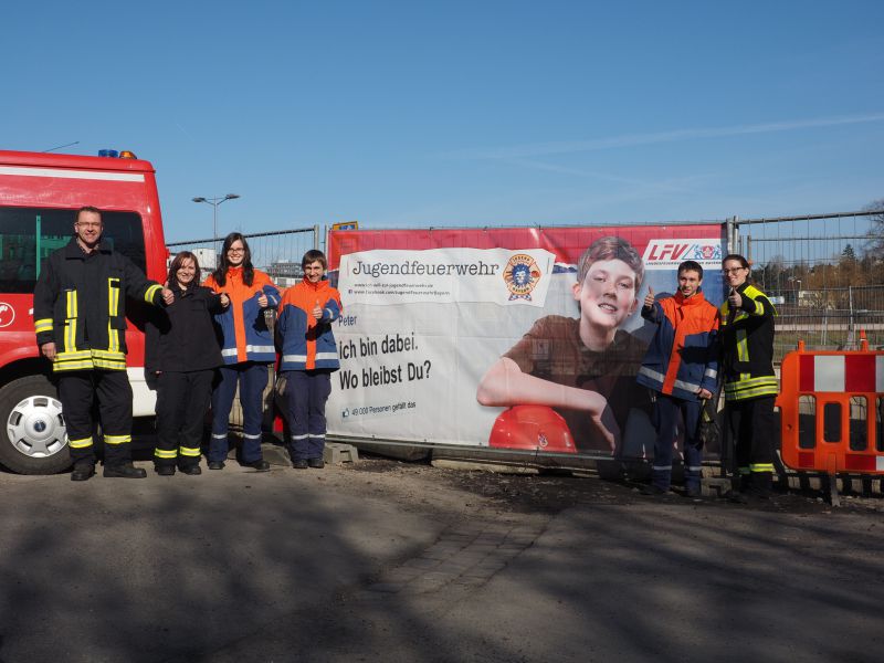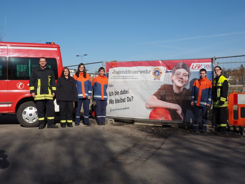 Die Jugendwartinnen Ramona Hochhuth und Melanie Mildner wurden bei dieser Aktion tatkräftig von einigen Jugendlichen und dem Kommandanten Horst Settler unterstützt. Begleitet wurde die Aktion auch von einem Fotografen der AWEAN, die uns freundlicherweise einige Abschnitte des Bauzauns für die Werbeaktion zur Verfügung stellt. An dieser Stelle nochmals vielen Dank für die Unterstützung.