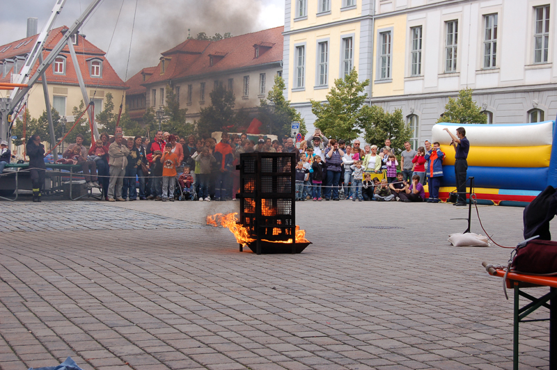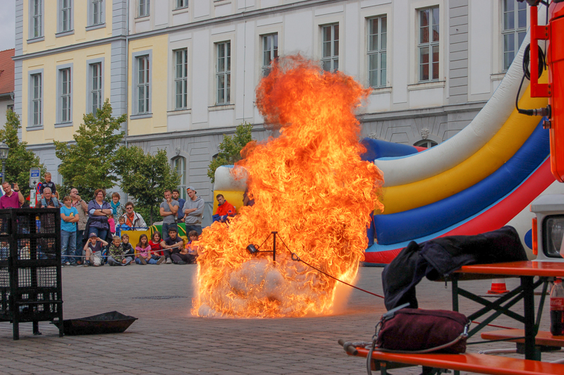 Hier durfte die Jugendfeuerwehr selbstverständlich nicht fehlen und so wurde unter anderem das Zerknallen einer Spraydose und die Folgen beim falschen Ablöschen eines Fettbrandes in der heimischen Küche demonstriert.