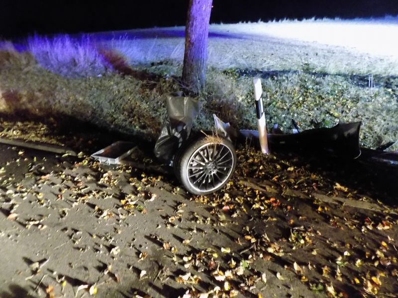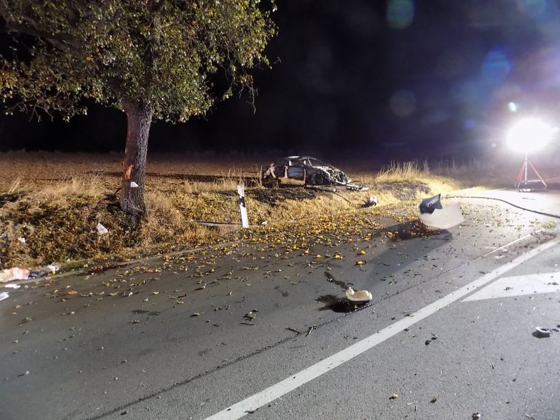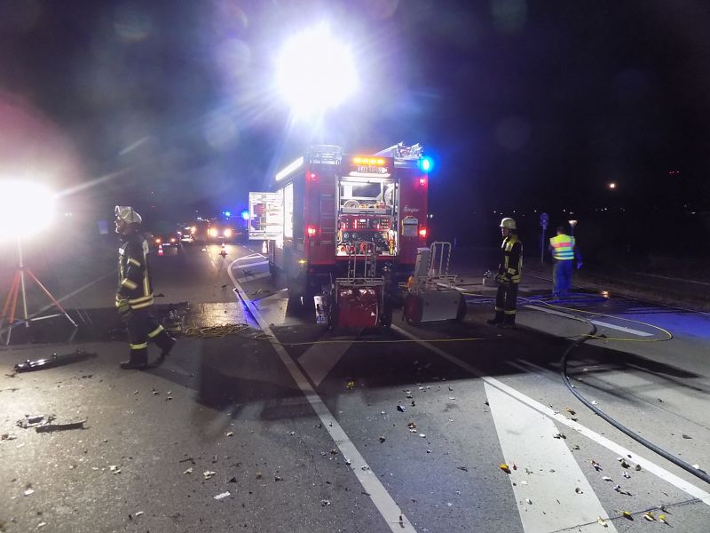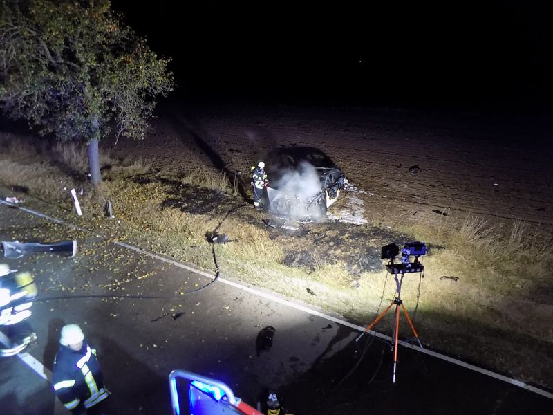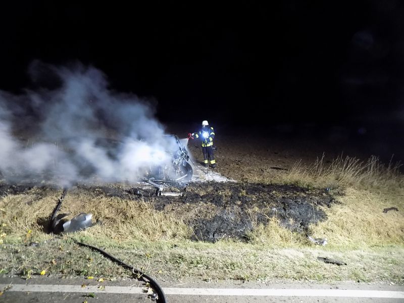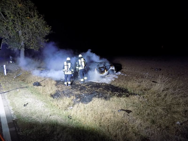 An der Einsatzstelle brannte nicht nur ein Pkw in voller Ausdehnung, sondern die Fahrerin lag bewusstlos auf der Fahrbahn und musste von Ersthelfern reanimiert werden. Der Beifahrer wurde bei dem Unfall schwer verletzt und vom Rettungsdienst in ein Krankenhaus verbracht. Die Fahrerin verstarb noch an der Unfallstelle. Während der Versorgung der Verletzten, löschte ein Trupp unter schwerem Atemschutz den Pkw und die in Brand geratene Böschung ab.