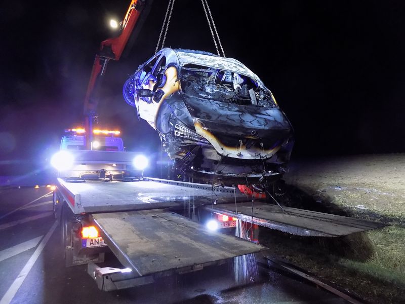 Trotz des schnellen Eingreifens brannte der Pkw völlig aus. Da sich die Unfallstelle über mehrere hunderte Meter erstreckte, dauerte die Unfallaufnahme durch den Gutachter länger als üblich und auch die Ausleuchtung der Unfallstelle musste mehrmals umgebaut werden.