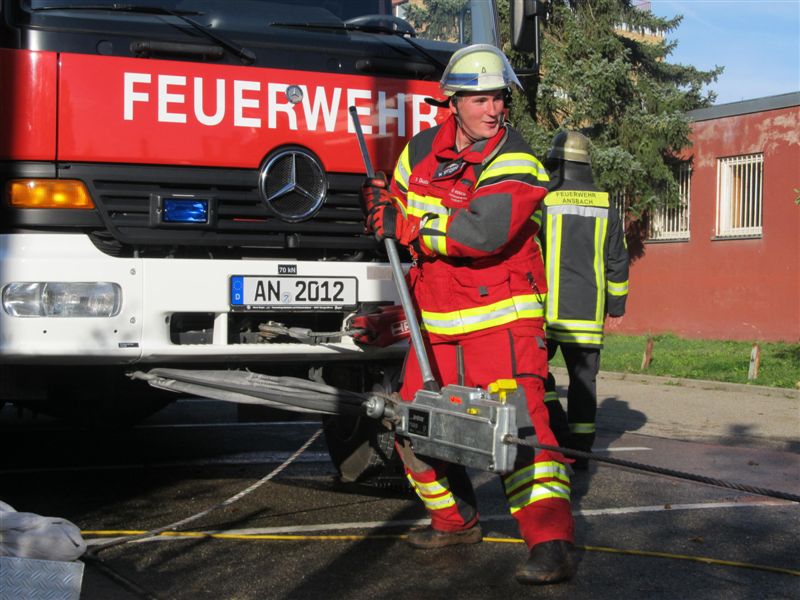 Während der Ausbildung, die insgesamt 35 Stunden umfasst, wurden mit den Teilnehmern die theoretischen und praktischen Ausbildungsinhalte der Grundausbildung vertieft und zusätzlich noch verschiedene Sondergeräte, die in der Feuerwache in Ansbach stationiert sind, erklärt und die Handhabung geübt.