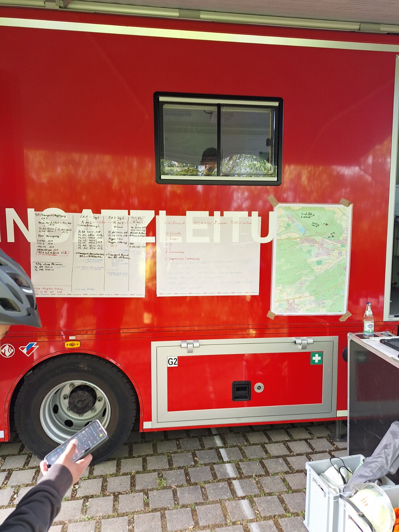 Nach Eintreffen erfolgte die erste Lageerkundung durch die Einsatzleitung mit Kommandowagen (KdoW), sowie der Polizei. Ein Verfügungsraum wurde eingerichtet, in dem sich die anrückenden Einsatzkräfte sammelten. Zur weiteren Lageerkundung aus der Luft kam eine Drohne der Unterstützungsgruppe (UG-Drohne) zum Einsatz.