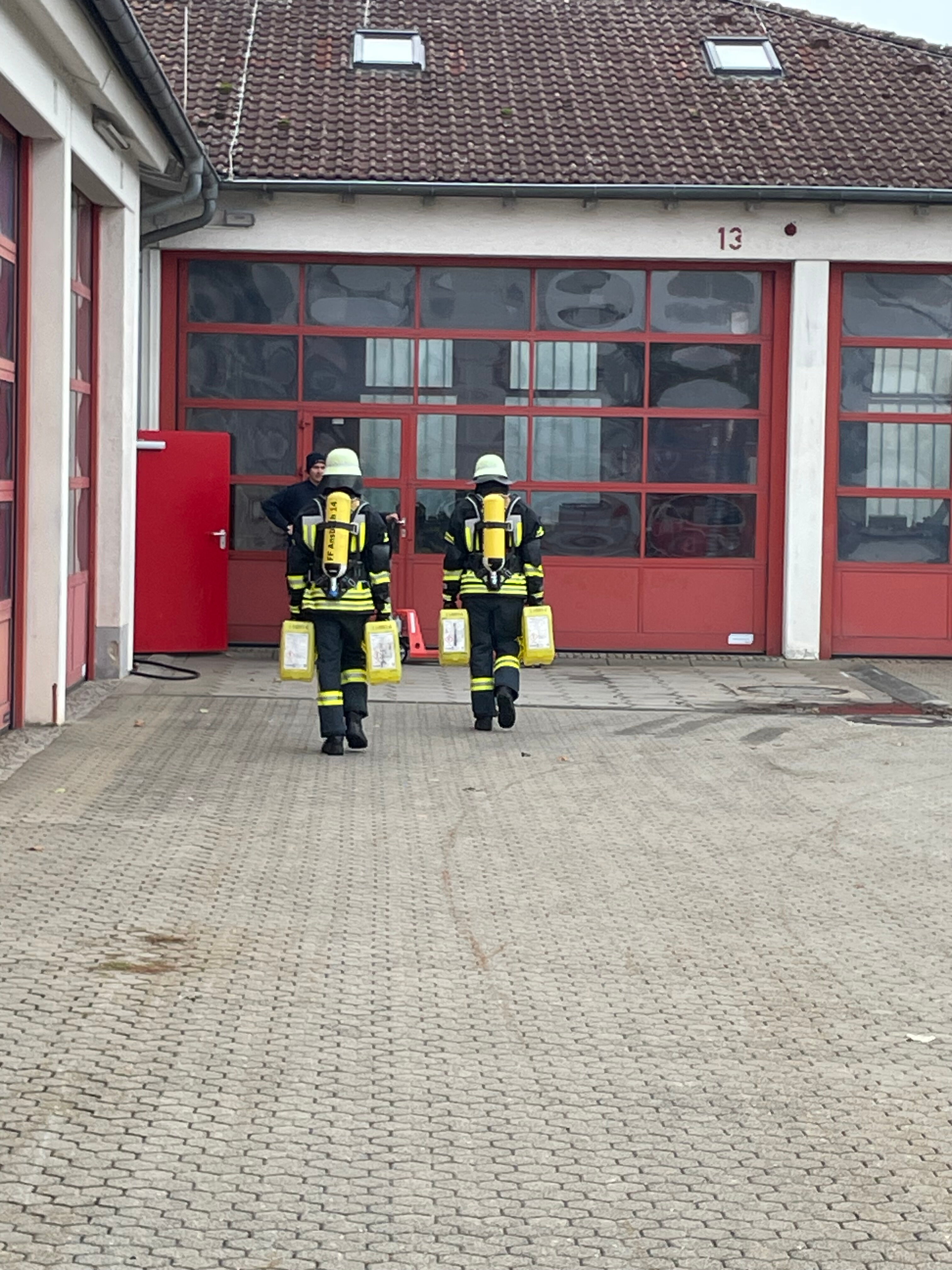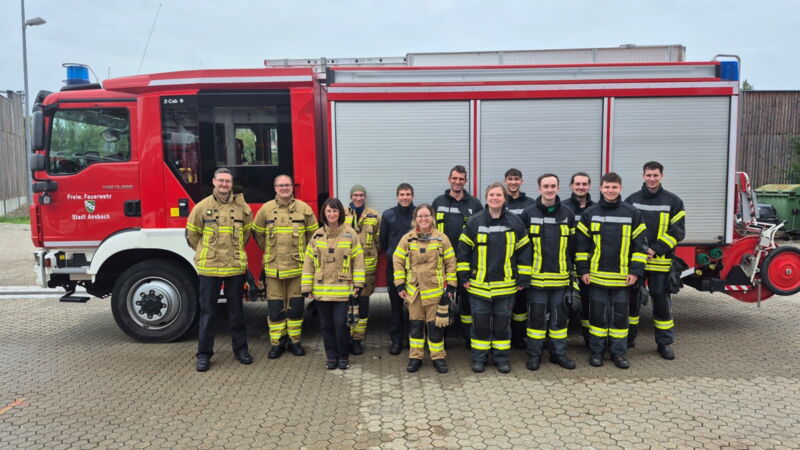 Die insgesamt 16 Feuerwehrangehörigen, davon drei Kameradinnen, übten nach kurzem Theorieunterricht den Umgang mit den drei bei der Feuerwehr Ansbach vorhandenen Schutzkleidungsformen.