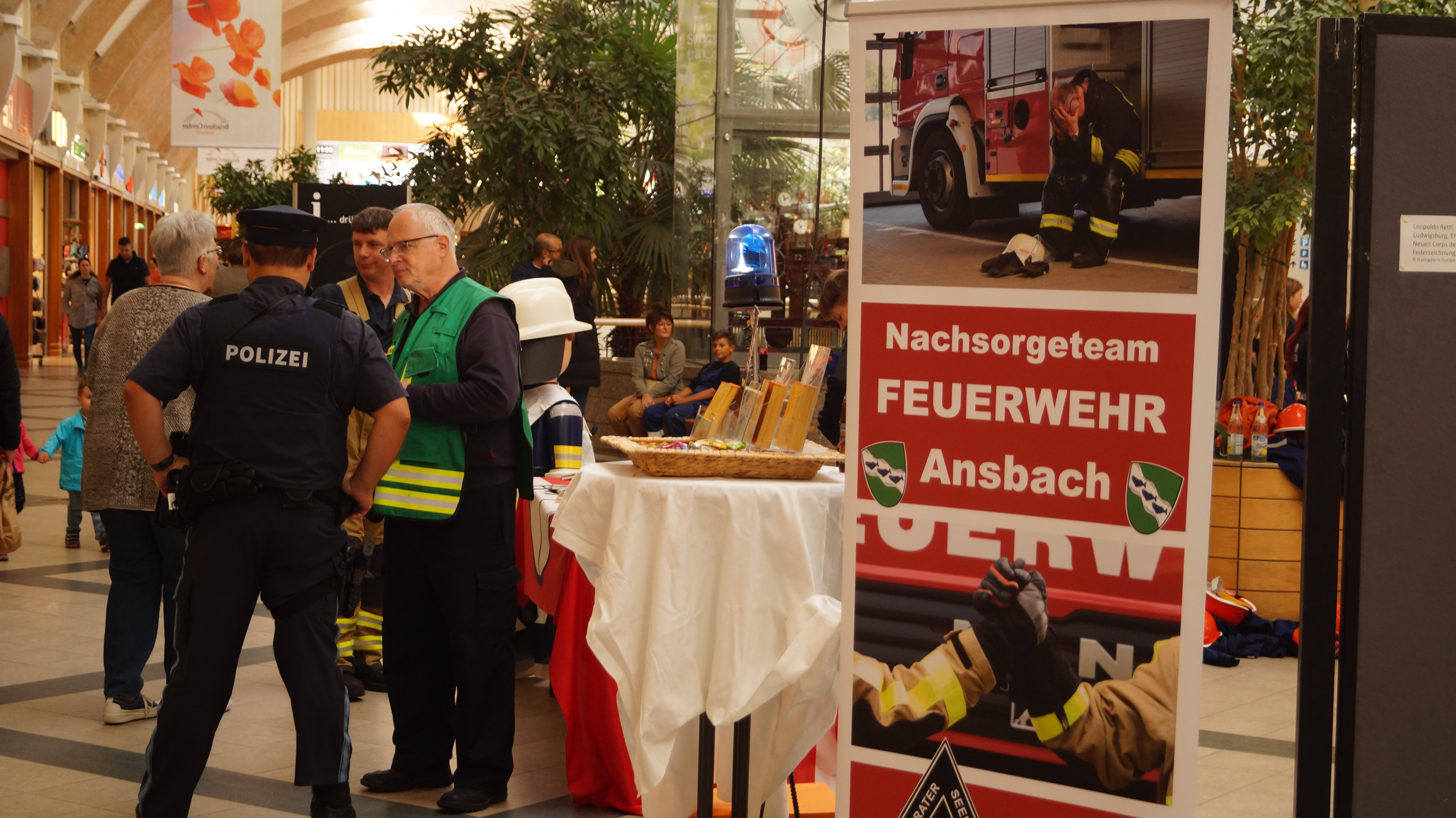 Die Kinder und Jugendfeuerwehr sowie die Feuerwehrseelsorge (PSNV) informierte in der inneren Ladenstraße über Ihre Tätigkeit und Jugendliche wurden durch die Anwärter animiert selbst ein Teil der großen Ansbacher Feuerwehreinheit zu werden.